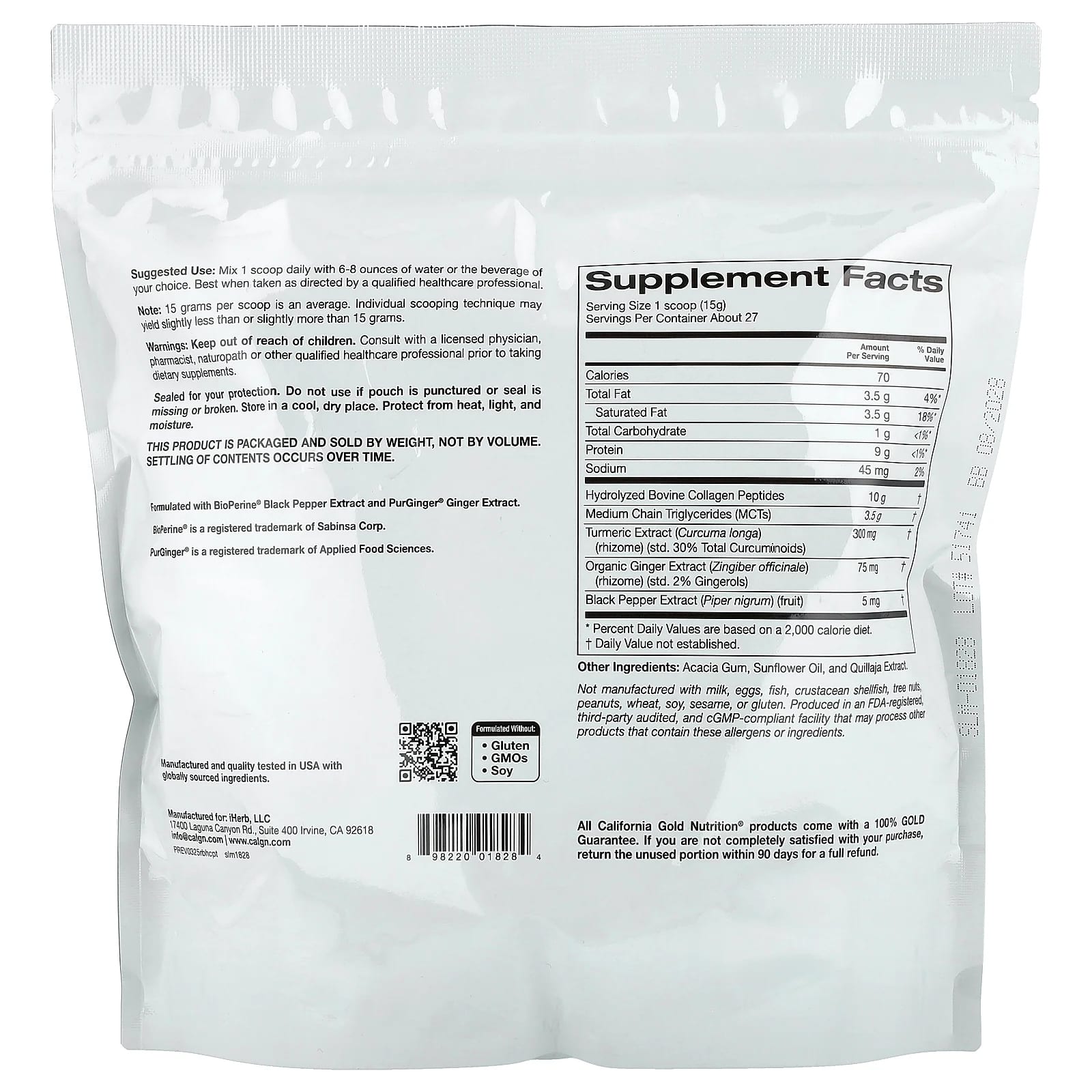 Гидролизованные пептиды бычьего коллагена, среднецепочечные триглицериды (MCT), экстракт корневища куркумы (Curcuma longa) (стандартизированный до 30% общих куркуминоидов), экстракт корневища органического имбиря (Zingiber officinale) (стандартизированный до 2% гингеролов), экстракт плодов черного перца (Piper nigrum).
