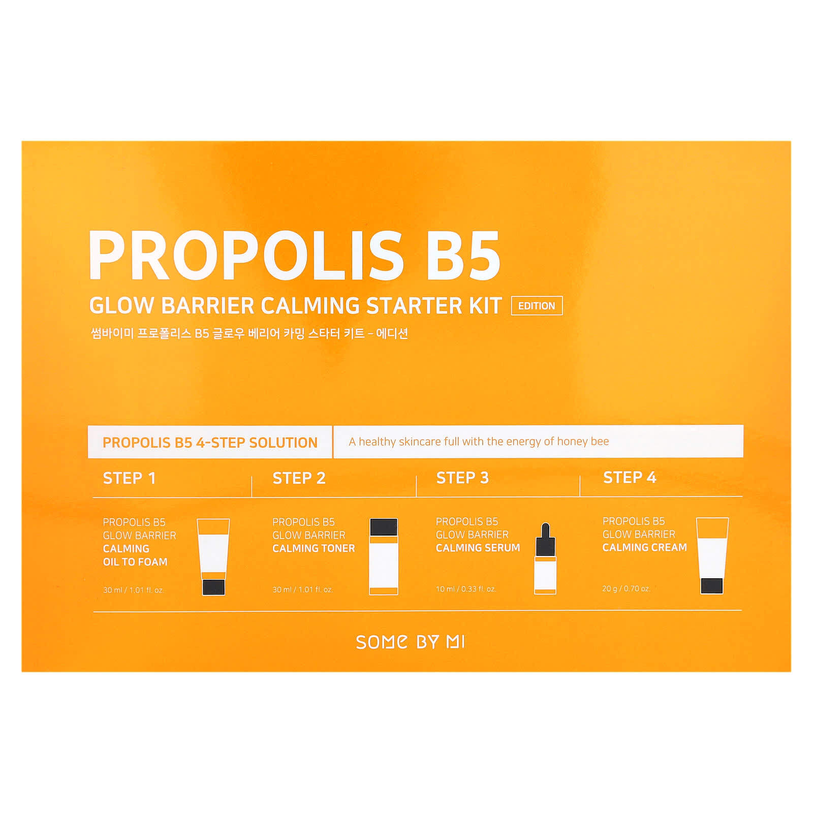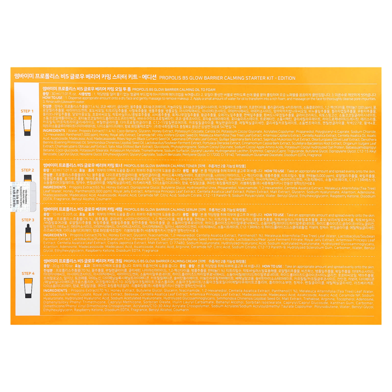 Вода, экстракт прополиса (11,4%), коко-бетаин, глицерин, экстракт меда, кокоат калия, рапсовое масло, кокоил глицинат калия, сополимер акрилатов, пропандиол, полиглицерил-4 капрат, хлорид натрия, 1,2-гександиол, пантенол (1000 част. / млн), мед, экстракт маточного молочка, керамид NP, масло из виноградных косточек (Vitis vinifera), экстракт листьев чайного дерева (Melaleuca alternifolia), экстракт полыни (Artemisia capillaris), экстракт готу колы (Centella asiatica), масло центеллы азиатской, азиатиковая кислота, азиатикозид, мадекассовая кислота, масло семян черной смородины (Madecassoside Ribes nigrum), экстракт листьев мыльнянки лекарственной (Saponaria officinalis), экстракт коры килайи сапонарии (Quillaja saponaria), экстракт плодов мыльного дерева (Sapindus mukorossi), экстракт листьев оливкового дерева (Оlea europaea), масло примулы вечерней (Oenothera biennis), масло семян жожоба (Simmondsia chinensis), ферментированный экстракт лактобактерии и соевых бобов, экстракт портулака огородного (Portulaca oleracea), экстракт коры кассии (Cinnamomum cassia), экстракт корня шлемника (Scutellaria baicalensis), экстракт листьев орегано (Origanum vulgare), экстракт листьев кипарисовика туполистного (Chamaecyparis obtusa), экстракт коры ивы (Salix alba), гликолипиды, фитосфингозин, кокоил глицинат натрия, кокоил натрия, яблочные аминокислоты, кокоил калия, гидролизованный белок овса, бабассуамидопропил бетаин, кокоглюкозид, стеарат калия, миристат калия, трометамин, сурфактин натрия, глицерил лаурат, гидрогенизированный лецитин, эритритол, каприловый/каприновый триглицерид, бутиленгликоль, дипропиленгликоль, c12-15 алкил бензоат, каприлилгликоль, гексиленгликоль, этилгексилглицерин, глицерил каприлат, бензоат натрия, пентилен гликоль, CI 17200, CI 19140, диацетат глутамата тетранатрия, двунатриевая ЭДТК, отдушка.