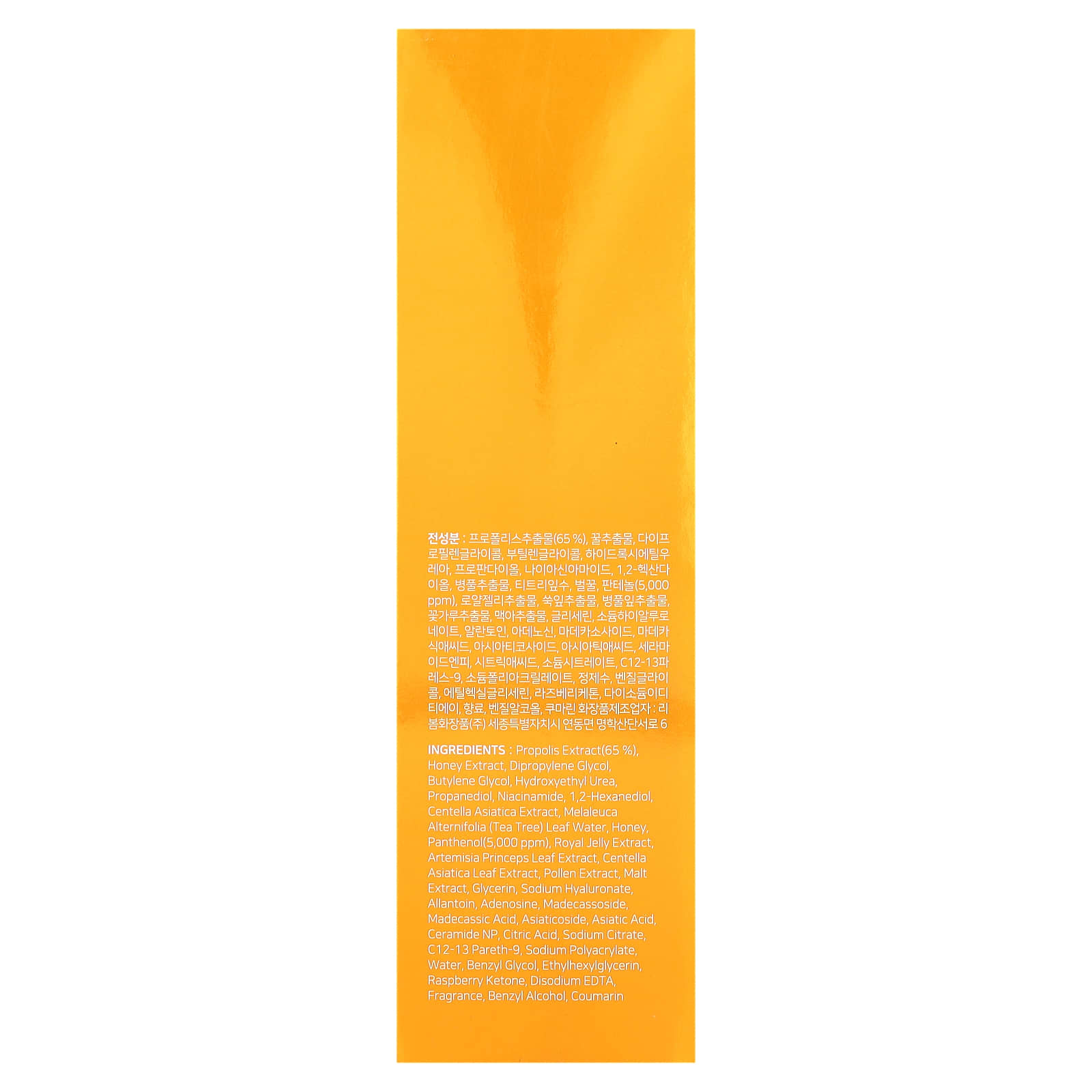 Экстракт прополиса (65%), экстракт меда, дипропиленгликоль, бутиленгликоль, гидроксиэтилированная мочевина, пропандиол, никотинамид, 1,2-гександиол, экстракт готу колы (Centella asiatica), вода из листьев чайного дерева (Melaleuca alternifolia), мед, пантенол (5000 част. / млн), экстракт маточного молочка, экстракт листьев полыни индийской (Аrtemisia princeps), экстракт листьев готу колы (Centella asiatica), экстракт пыльцы, экстракт солода, глицерин, гиалуронат натрия, аллантоин, аденозин, мадекассозид, мадекассовая кислота, азиатикозид, азиатиковая кислота, керамид NP, лимонная кислота, цитрат натрия, c12-13 парет-9, полиакрилат натрия, вода, бензилгликоль, этилгексилглицерин, малиновый кетон, двунатриевая ЭДТК, отдушка, бензиловый спирт, кумарин.