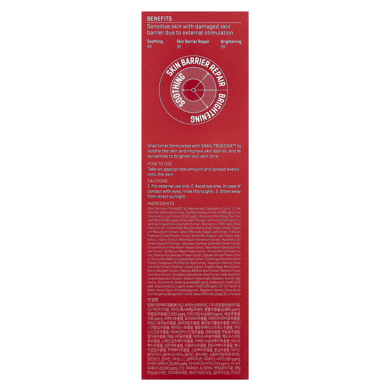 Фильтрат секрета улитки (90%), никотинамид, дипропиленгликоль, 1,2-гександиол, гидроксиэтилированная мочевина, экстракт центеллы азиатской (4985 част. / млн), экстракт листьев центеллы азиатской (3500 част. / млрд), вода из листьев чайного дерева (Melaleuca alternifolia) (4800 част. / млн), экстракт листьев полыни (Artemisia princeps) (100 част. / млн), экстракт лаванды (Lavandula angustifolia), экстракт розмарина (Rosmarinus officinalis), экстракт цветков ромашки лекарственной (Chamomilla recutita), экстракт герани пятнистой (Geranium maculatum), экстракт листьев шалфея (Salvia officinalis), экстракт цветков красного клевера (Trifolium pratense), экстракт листьев алхемиллы (Alchemilla vulgaris), экстракт ройбуша (Aspalathus linearis), экстракт бессмертника (Helichrysum arenarium), экстракт гиацинта (Hyacinthus orientalis), экстракт цветов арабского жасмина (Jasminum sambac), экстракт цветков хризантемы морифолиум, экстракт цветков лотоса (Nelumbium speciosum), экстракт цветков черной самбукуса, экстракт цветков мумие, экстракт цветков робинии псевдоакации, экстракт цветков спиреи ульмарии, экстракт корня солодки (Glycyrrhiza glabra), экстракт корня клопогона кистевидного (Cimicifuga racemosa), экстракт корня горца многоцветкового (Polygonum multiflorum), экстракт семян кунжута (Sesamum indicum), экстракт санхвана (Phellinus linteus), экстракт корня дудника гигантского (Angelica gigas), экстракт коры шелковицы белой (Morus alba), экстракт корня альбифлора (Paeonia albiflora), экстракт корня софоры желтоватой (Sophora flavescens), экстракт корня шлемника (Scutellaria baicalensis), гидролизованные гликозаминогликаны, глицерин, гиалуронат натрия, аллантоин, арбутин, аденозин, глутатион, мадекассосид (90 част. / млн), мадекассовая кислота (5000 част. / млрд), азиатикозид (11,5 част. / млн), азиатиковая кислота (5000 част. / млрд), c12-13 вода парет-9, бензилгликоль, этилгексилглицерин, малиновый кетон, масло из плодов бергамота (Citrus auran tium bergamia), масло шалфея (Salvia officinalis), лимонен.