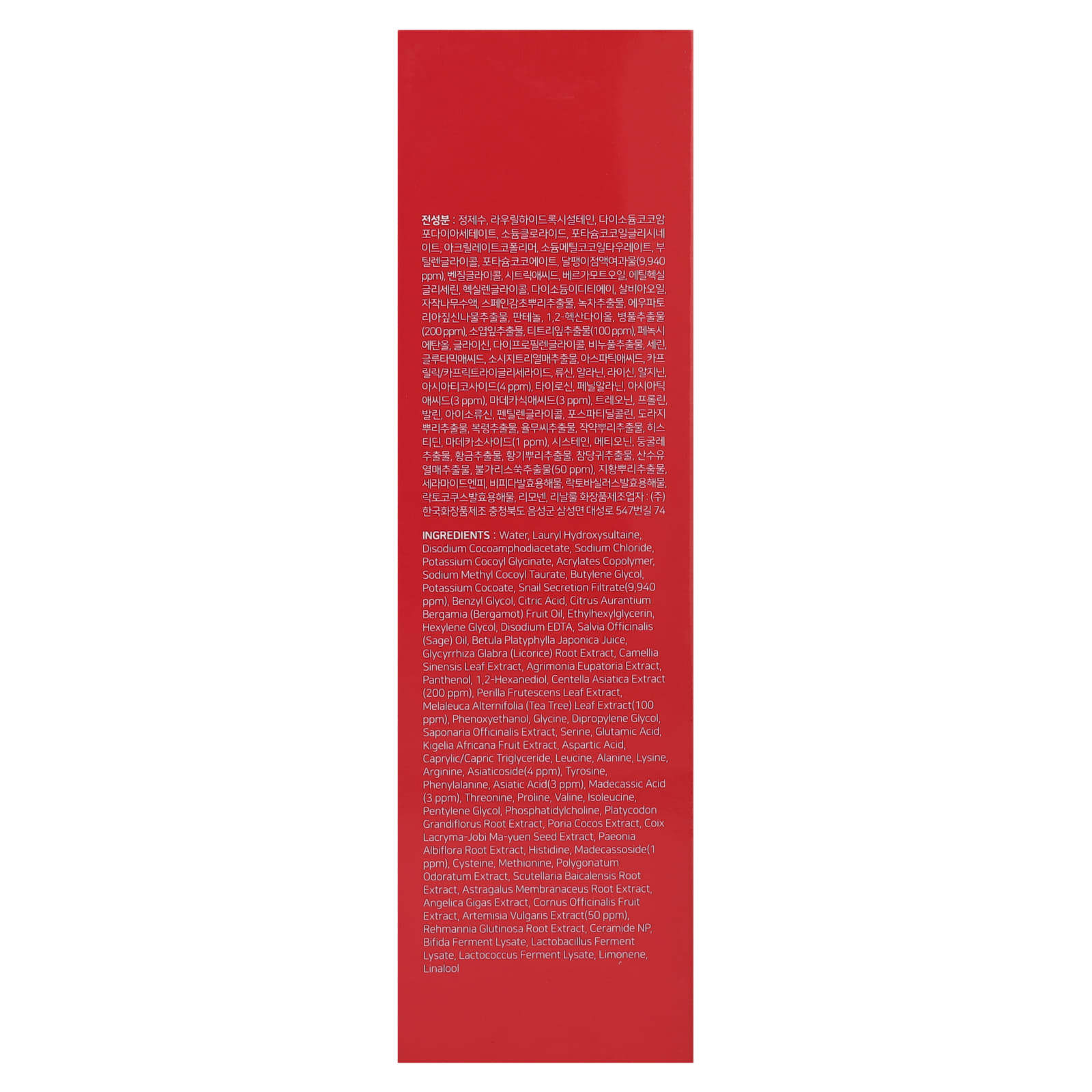 Вода, лаурил гидроксисултаин, кокоамфодиацетат динатрия, хлорид натрия, кокоил глицинат калия, сополимер акрилатов, натрия метил кокоил таурат, бутиленгликоль, кокоат калия, фильтрат секрета улитки (9940 част./млн), бензилгликоль, лимонная кислота, масло из плодов бергамота (citrus aurantium bergamia), этилгексилглицерин, гексиленгликоль, двунатриевая ЭДТК, масло шалфея (Salvia officinalis), сок березы плосколистной японской (betula platyphylla japonica), экстракт корня солодки (glycyrrhiza glabra), экстракт листьев зеленого чая (camellia sinensis), экстракт репешка (agrimonia eupatoria), пантенол, 1,2-гександиол, экстракт готу колы (Centella asiatica) (200 част./млн), экстракт листьев периллы (Perilla ocymoides), экстракт листьев чайного дерева (Melaleuca alternifolia) (100 част./млн), феноксиэтанол, глицин, дипропиленгликоль, экстракт мыльнянки лекарственной (saponaria officinalis), серин, глутаминовая кислота, экстракт плодов кигелии (kigelia africana), аспарагиновая кислота, каприловый/каприновый триглицерид, лейцин, аланин, лизин, аргинин, азиатикозид (4 част./млн), тирозин, фенилаланин, азиатиковая кислота (3 част./млн), мадекассовая кислота (3 част./млн), треонин, пролин, валин, изолейцин, пентилен гликоль, фосфатидилхолин, экстракт корня платикодона крупноцветкового (Platycodon grandiflorus), экстракт трутового гриба (Poria cocos), экстракт семян бусенника (coix lacryma-jobi ma-yuen), экстракт корня пиона молочноцветкового (Paeonia albiflora), гистидин, мадекассосид (1 част./млн), цистеин, метионин, экстракт купены аптечной (polygonatum odoratum), экстракт корня шлемника (scutellaria baicalensis), экстракт корня астрагала перепончатого (astragalus membranaceus), экстракт корня дудника гигантского (angelica gigas), экстракт плодов кизила лекарственного (Cornus officinalis), экстракт полыни (Artemisia vulgaris) (50 част./млн), экстракт корня ремании клейкой (Rehmannia glutinosa), керамид NP, лизат ферментов бифидобактерий, лизат фермента молочнокислых бактерий (Lactobacillus), лизат ферментов лактококка, лимонен, линалоол.