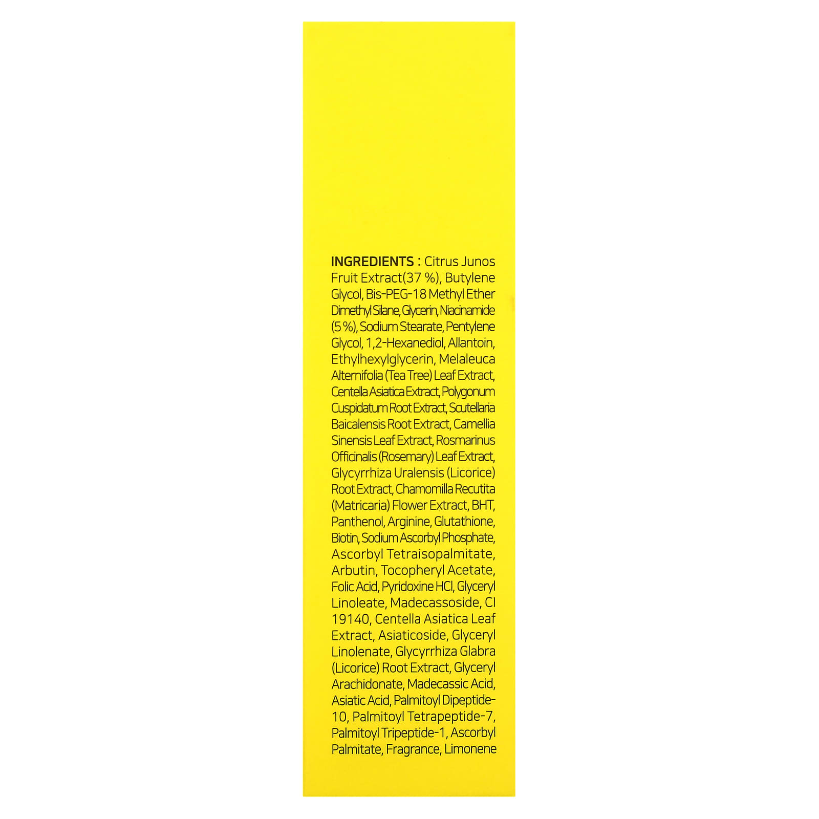 Экстракт плодов юноши (Citrus junos) (37%), бутиленгликоль, бис-ПЭГ-18 метиловый эфир диметиловый силан, глицерин, никотинамид (5%), стеарат натрия, пентилен гликоль, 1,2-гександиол, аллантоин, этилгексилглицерин, экстракт листьев чайного дерева (Melaleuca alternifolia), экстракт готу колы (Centella asiatica), экстракт корня рейнутрии японской (Polygonum cuspidatum), экстракт корня шлемника (Scutellaria baicalensis), экстракт листьев зеленого чая (Camellia sinensis), экстракт листьев розмарина (Rosmarinus officinalis), экстракт корня солодки уральской (Glycyrrhiza uralensis), экстракт цветков ромашки лекарственной (Chamomilla recutita), бутилгидрокситолуол, пантенол, аргинин, глутатион, биотин, аскорбил фосфат натрия, аскорбил тетраизопальмитат, арбутин, токоферилацетат, фолиевая кислота, пиридоксина гидрохлорид, глицерил линолеат, мадекассосид, CI 19140, экстракт листьев готу колы (Centella asiatica), азиатикозид, глицерил линоленат, экстракт корня солодки (Glycyrrhiza glabra), глицерил арахидонат, мадекассовая кислота, азиатиковая кислота, пальмитоил дипептид-10, пальмитоил тетрапептид-7, пальмитоил трипептид-1, аскорбил пальмитат, отдушка, лимонен.