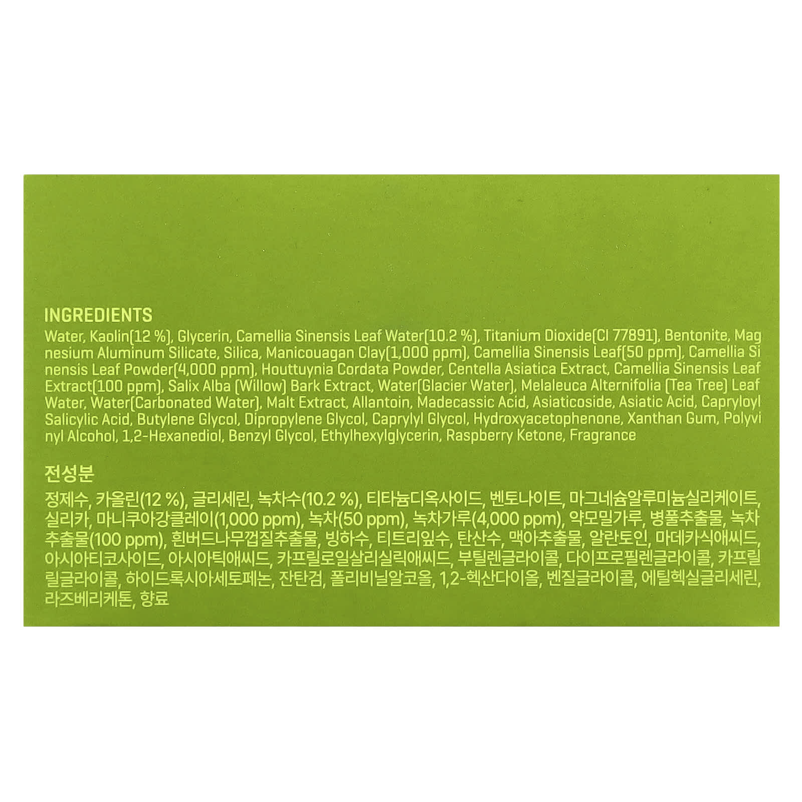 Вода, каолин (12%), глицерин, вода из листьев зелёного чая (Camellia sinensis) [10,2%], диоксид титана (CI 77891), бентонит, силикат магния и алюминия, диоксид кремния, маникуаганская глина (1000 част./млн), листья зелёного чая (Camellia sinensis) (50 част./млн), порошок из листьев зелёного чая (Camellia sinensis) (4000 част./млн), порошок из хауттюйнии (Houttuynia cordata), экстракт готу колы (Centella asiatica), экстракт листьев зелёного чая (Camellia sinensis) (100 част./млн), экстракт коры ивы белой (Salix alba), вода (ледниковая вода), вода из листьев чайного дерева (Melaleuca alternifolia), вода (газированная вода), экстракт солода, аллантоин, мадекассовая кислота, азиатикозид, азиатиковая кислота, каприлоил салициловая кислота, бутиленгликоль, дипропиленгликоль, каприлилгликоль, гидроксиацетофенон, ксантановая камедь, поливиниловый спирт, 1,2-гександиол, бензил гликоль, этилгексилглицерин, малиновый кетон, отдушка.