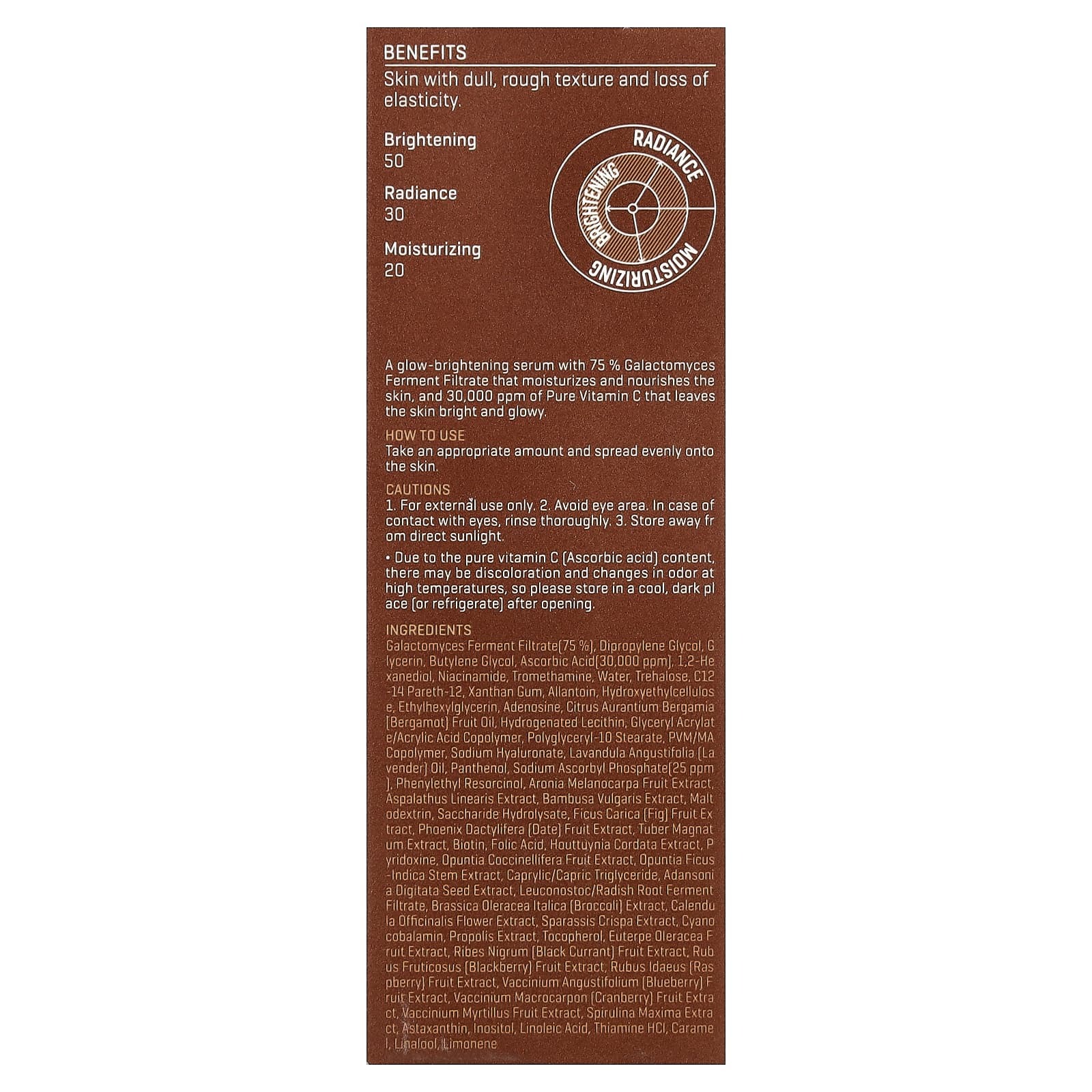 Придающая сияние сыворотка с 75% фильтратом фермента галактомицетов, который увлажняет и питает кожу, и 30 000 част./млн чистого витамина С, придающего коже яркости и сияния.