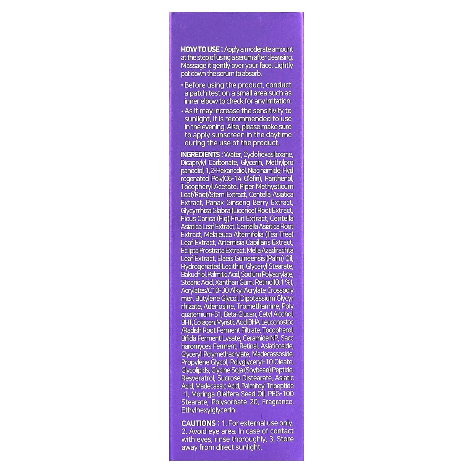 Вода, циклогексасилоксан, дикаприлил карбонат, глицерин, метилпропандиол, 1,2-гександиол, никотинамид, гидрогенизированный поли (C6-14 олефин), пантенол, токоферилацетат, экстракт листьев/корней/стеблей перца опьяняющего (Piper methysticum), экстракт готу колы (Centella asiatica), экстракт ягод женьшеня обыкновенного (Panax ginseng), экстракт корня солодки (Glycyrrhiza glabra), экстракт плодов инжира (Ficus carica), экстракт листьев готу колы (Centella asiatica), экстракт корня готу колы (Centella asiatica), экстракт листьев чайного дерева (Melaleuca alternifolia), экстракт полыни волосовидной (Artemisia capillaris), экстракт эклипты простертой (Eclipta prostrata), экстракт листьев дерева ним (Melia azadirachta), пальмовое масло (Elaeis guineensis), гидрогенизированный лецитин, глицерил стеарат, бакучиол, пальмитиновая кислота, полиакрилат натрия, стеариновая кислота, ксантановая камедь, ретинол (0,1%), акрилат/c10-30 алкил акрилат кроссполимер, бутиленгликоль, дикалия глицирризат, аденозин, трометамин, поликватерниум-51, бета-глюкан, цетиловый спирт, бутилгидрокситолуол, коллаген, миристиновая кислота, бутилоксианизол, лейконосток/ферментированный фильтрат корнеплода редиса, токоферол, лизат продукта ферментации бифидобактерий, керамид NP, продукт ферментации сахаромицетов, ретиналь, азиатикозид, глицерил полиметакрилат, мадекассосид, пропиленгликоль, полиглицерил-10 олеат, гликолипиды, пептид соевых бобов (Glycine soja), ресвератрол, дистеарат сахарозы, азиатиковая кислота, мадекассовая кислота, пальмитоил трипептид -1, масло из семян моринги масличной (Moringa oleifera), ПЭГ-100 стеарат, полисорбат 20, отдушка, этилгексилглицерин.