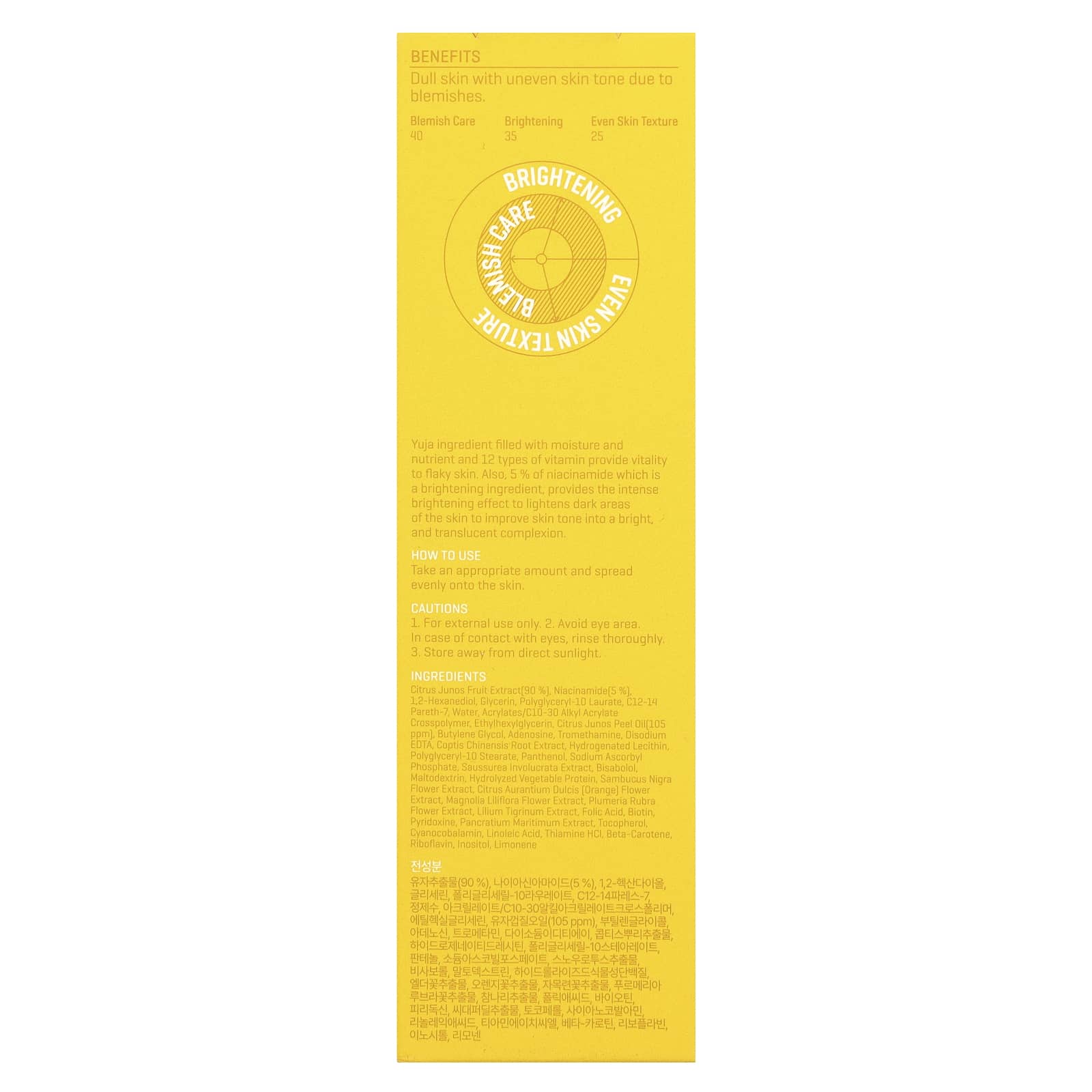 Юдзу, богатый влагой и питательными веществами, а также 12 видов витаминов придают жизненые силы шелушащейся коже. Кроме того, 5% никотинамида, который является осветляющим ингредиентом, обеспечивает интенсивный осветляющий эффект, осветляет темные участки кожи, улучшает тон и придает коже сияние.