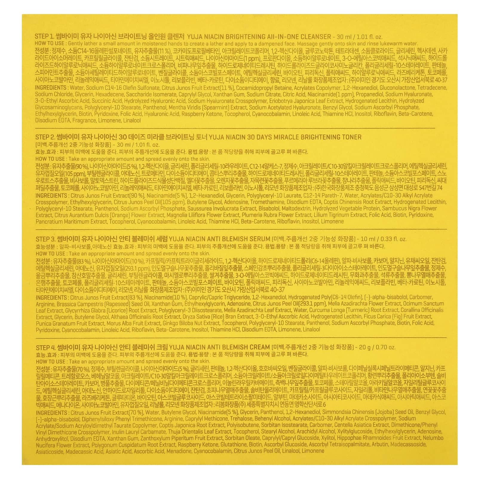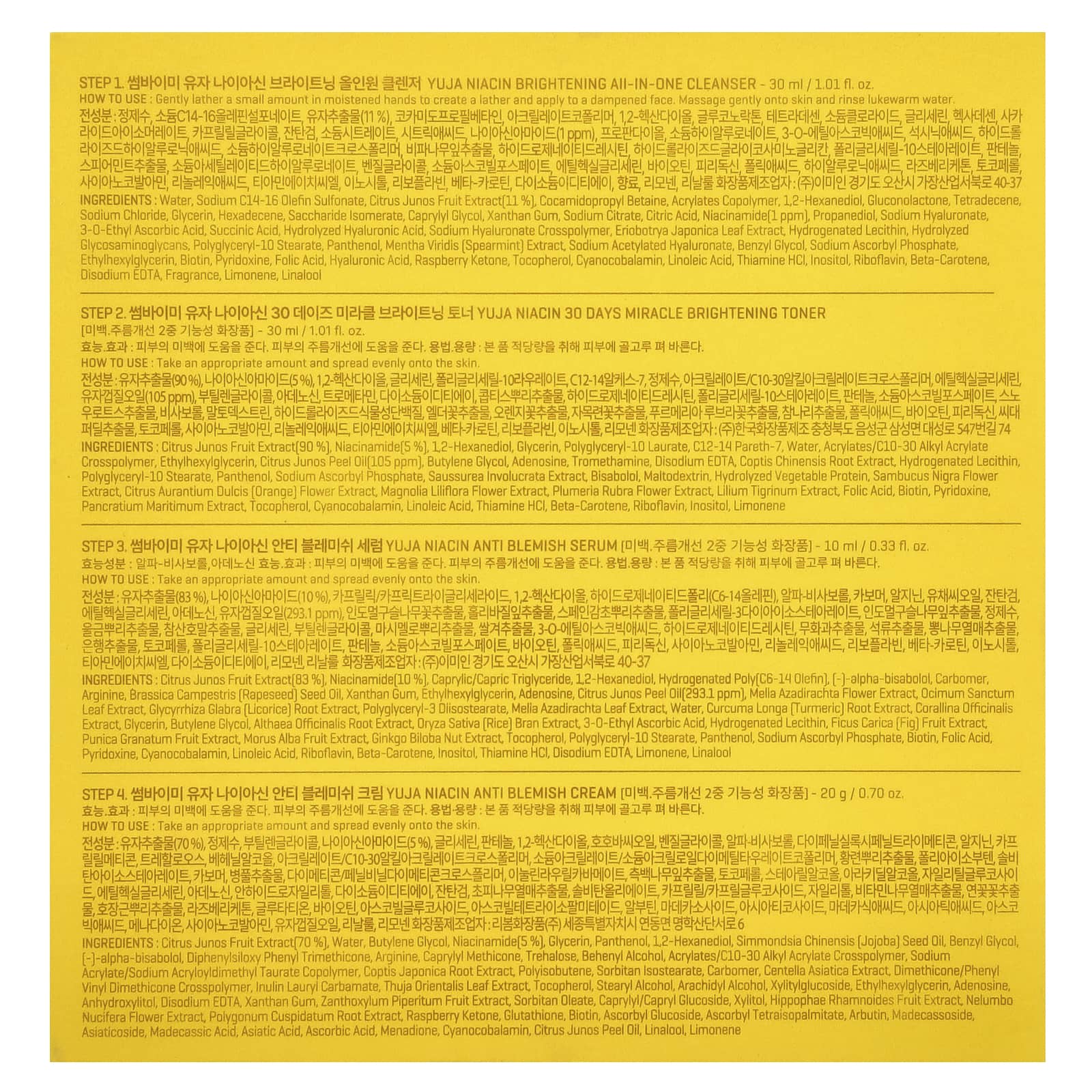 Юя ниацин, Сыворотка против высыпаний: Экстракт плодов юдзу (Citrus junos) [83%], никотинамид [10 %], каприловый/каприновый триглицерид, 1,2-гександиол, гидрогенизированный поли[c6-14 олефин], [-]-альфа-бисаболол, карбомер, аргинин, рапсовое масло (Brassica campestris), ксантановая камедь, этилгексилглицерин, аденозин, масло из кожуры юдзу (Citrus junos) [293,1 част./млн), экстракт цветков меда (Mella azadirachta), экстракт листьев туласи (Ocimum sanctum), экстракт корня солодки (Glycyrrhiza glabra), полиглицерил-3 диизостеарат, экстракт листьев дерева ним (Melia azadirachta), вода, экстракт корня куркумы (Curcuma longa), экстракт кораллины лекарственной (Corallina officinalis), глицерин, бутиленгликоль, экстракт корня алтея (Althaea officinalis), экстракт рисовых отрубей (Oryza sativa), 3-0-этил-аскорбиновая кислота, гидрогенизированный лецитин, экстракт плодов инжира (Ficus carica), экстракт плодов граната (Punica granatum), экстракт плодов белой шелковицы (Morus alba), экстракт орехов гинкго билоба (Ginkgo biloba), токоферол, полиглицерил-10 стеарат, пантенол, аскорбил фосфат натрия, биотин, фолиевая кислота, пиридоксин, цианокобаламин, линолевая кислота, рибофлавин, бета-каротин, инозитол, тиамина гидрохлорид, двунатриевая ЭДТК, лимонен, линалоола.