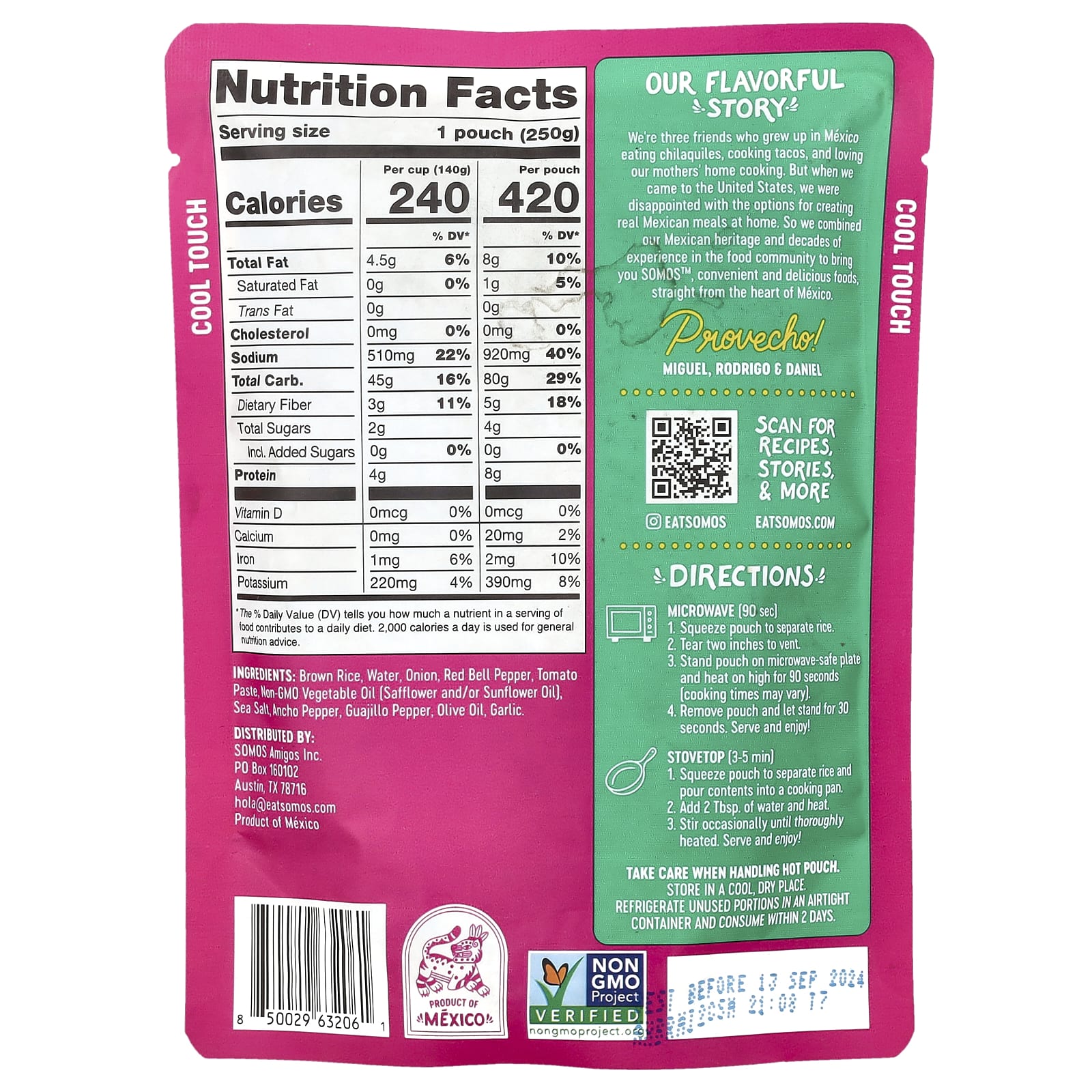 Коричневый рис, вода, лук, красный перец, томатная паста, растительное масло без ГМО (сафлоровое и / или подсолнечное масло), морская соль, анчо, перец гуахильо, оливковое масло, чеснок.