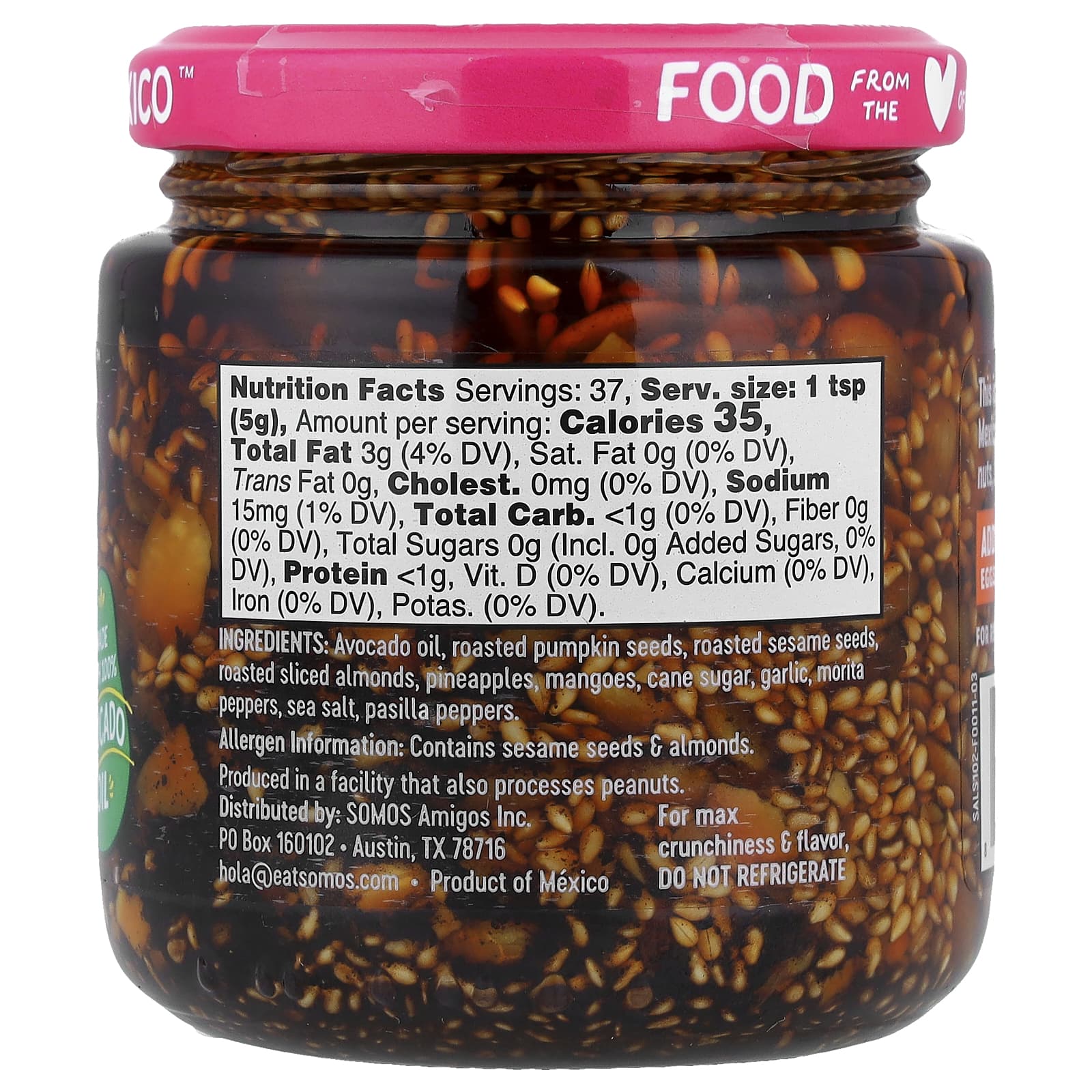 Масло авокадо, обжаренные семена тыквы, обжаренные семена кунжута, обжаренный нарезанный миндаль, ананасы, манго, тростниковый сахар, чеснок, перец морита, морская соль, перец пасилья.