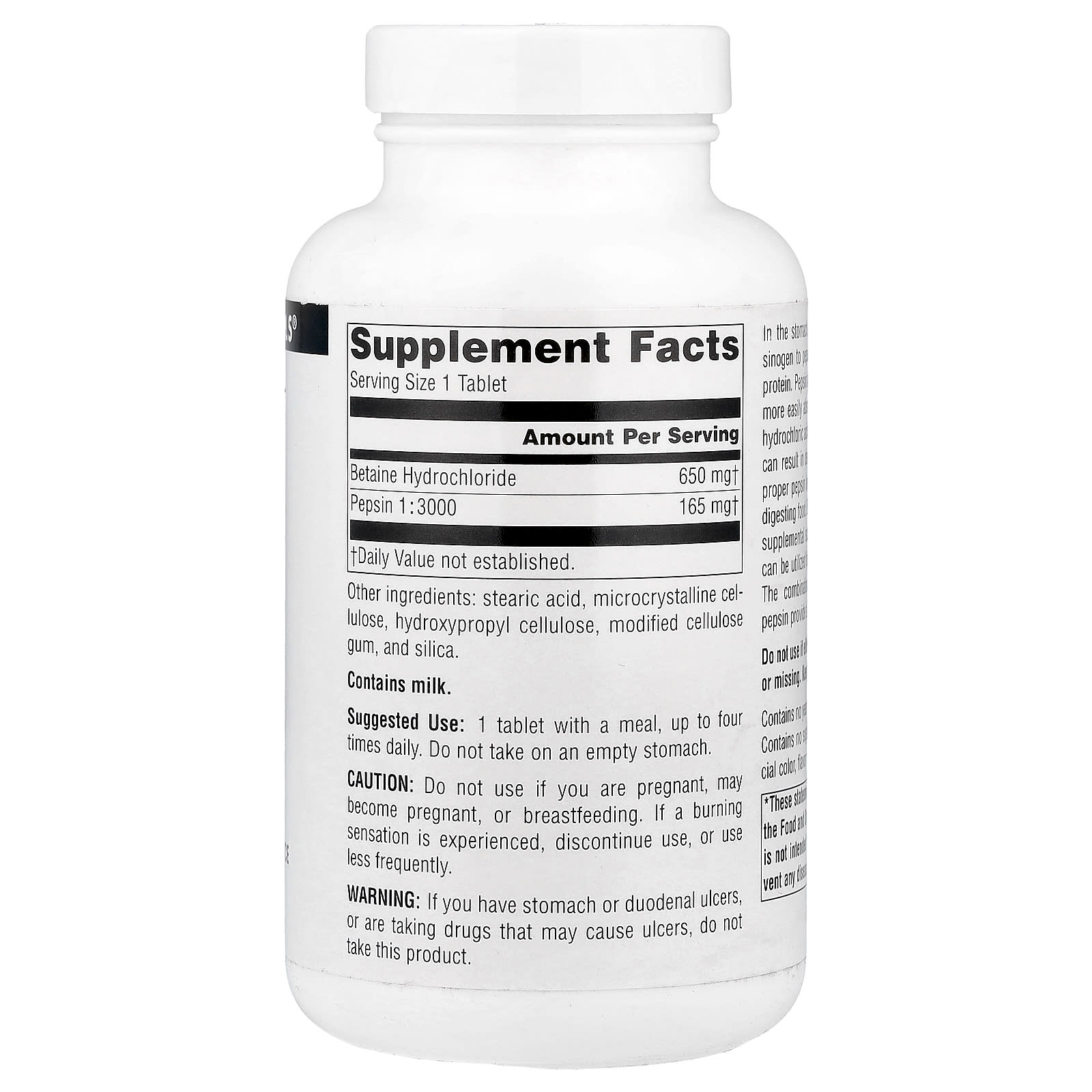 В желудке соляная кислота превращает пепсиноген в пепсин — фермент, расщепляющий белок. Пепсин расщепляет белки на более мелкие, более легко усваиваемые вещества. С возрастом выработка соляной кислоты может снижаться, что приводит к снижению уровня пепсина. Без надлежащего уровня пепсина организму трудно переваривать пищу. Бетаина гидрохлорид используется в качестве дополнительного источника соляной кислоты, которая может использоваться желудком для выработки пепсина. Сочетание бетаина гидрохлорида и пепсина обеспечивает отличное тонизирующее действие на желудок.