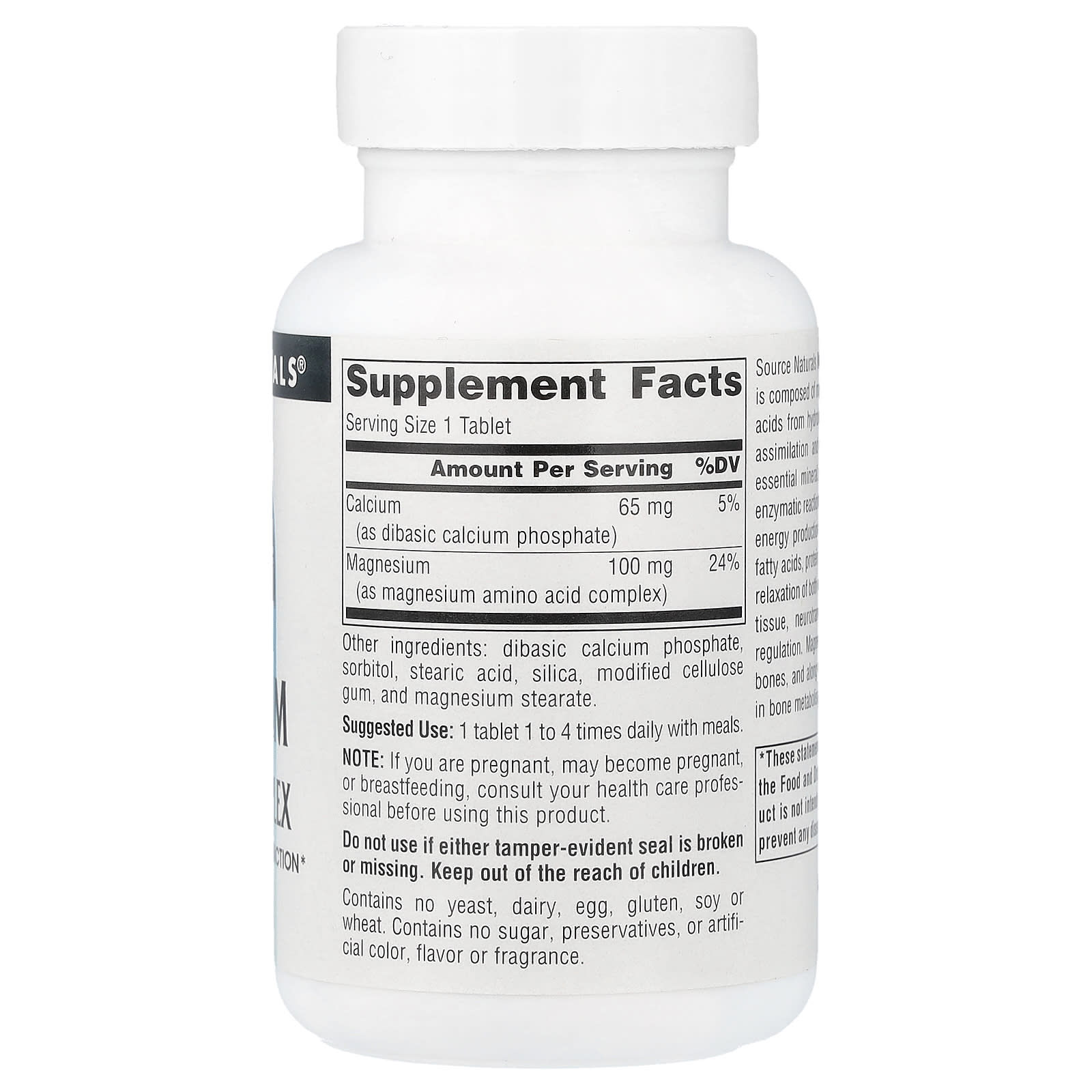 Комплекс хелата магния от Source Naturals состоит из магния в комплексе с аминокислотами из гидролизованного растительного белка, который легко усваивается и используется. Магний — важный минерал, который играет ключевую роль в более чем 300 ферментативных реакциях обмена веществ. Он участвует в производстве и хранении энергии, расщеплении жирных кислот, синтезе белка, метаболизме ДНК, расслаблении как добровольной, так и непреднамеренной мышечной ткани, активности нейромедиаторов и регуляции гормонов. Магний накапливается в основном в костях и вместе с другими минералами играет важную роль в метаболизме костей.