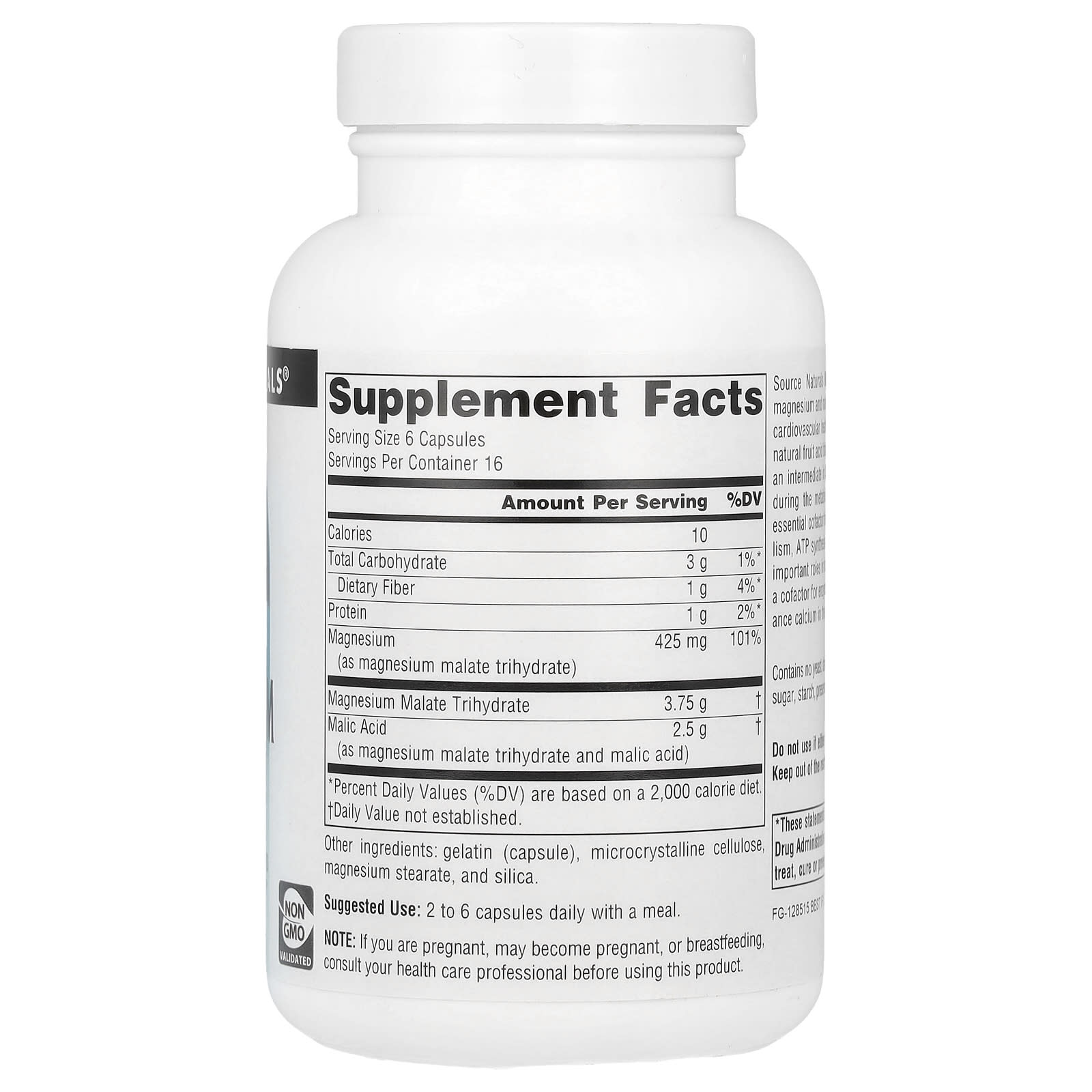 Малат магния Source Naturals - это соединение магния и яблочной кислоты. Он поддерживает правильную работу мышц, здоровье сердечно-сосудистой системы и выработку энергии. Яблочная кислота - это натуральная фруктовая кислота, которая присутствует в большинстве клеток организма и является промежуточным звеном в цикле Кребса, где энергия улавливается в процессе метаболизма углеводов и жиров. Магний является важным кофактором для более чем 300 ферментативных реакций в метаболизме, синтезе АТФ и выработке энергии. Магний играет важную роль в расслаблении мышц из-за своей функции кофактора ферментов и из-за его способности уравновешивать кальций в клетке.
