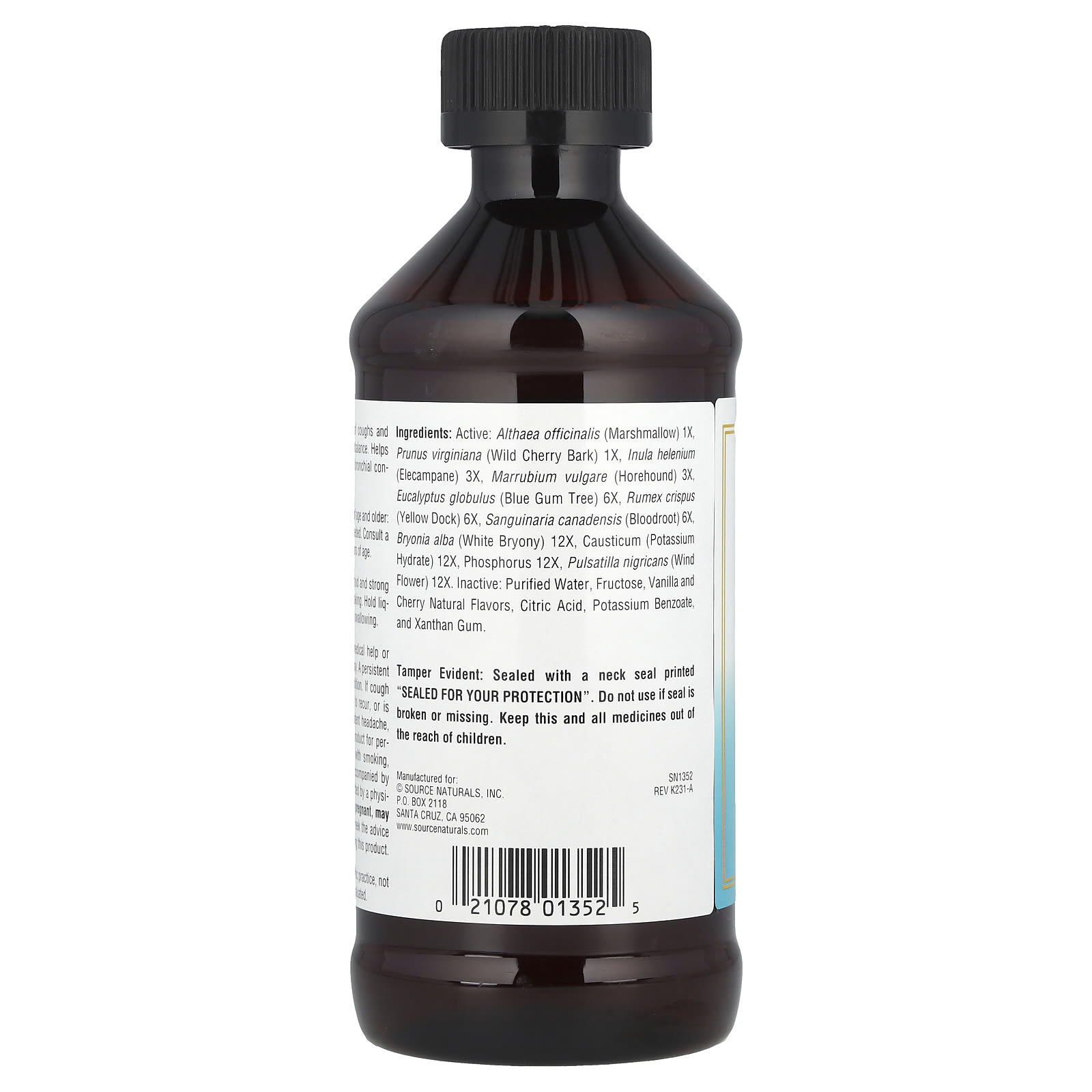 Активный: Althea officinalis (зефир) 1X, prunus virginiana (дикая вишня) 1X, inula helenium (elecampane) 3X, marrubium vulgare (horehound) 3X, эвкалипт globulus (синяя камедь) 6X, rumex crispus (желтый док) 6X, sanguinaria canadensis (корень крови) 6X, bryonia alba (белый брионий) 12X, каустик (гидрат калия) 12X, nux vomica (ядовитая гайка) 12X, фосфор 12X, пульсатилла nigricans (цветок ветра) 12X. Неактивные: очищенная вода, фруктоза, натуральные вишневые и ванильные ароматизаторы, натуральный цвет, лимонная кислота, бензонат калия и ксантановая смола.