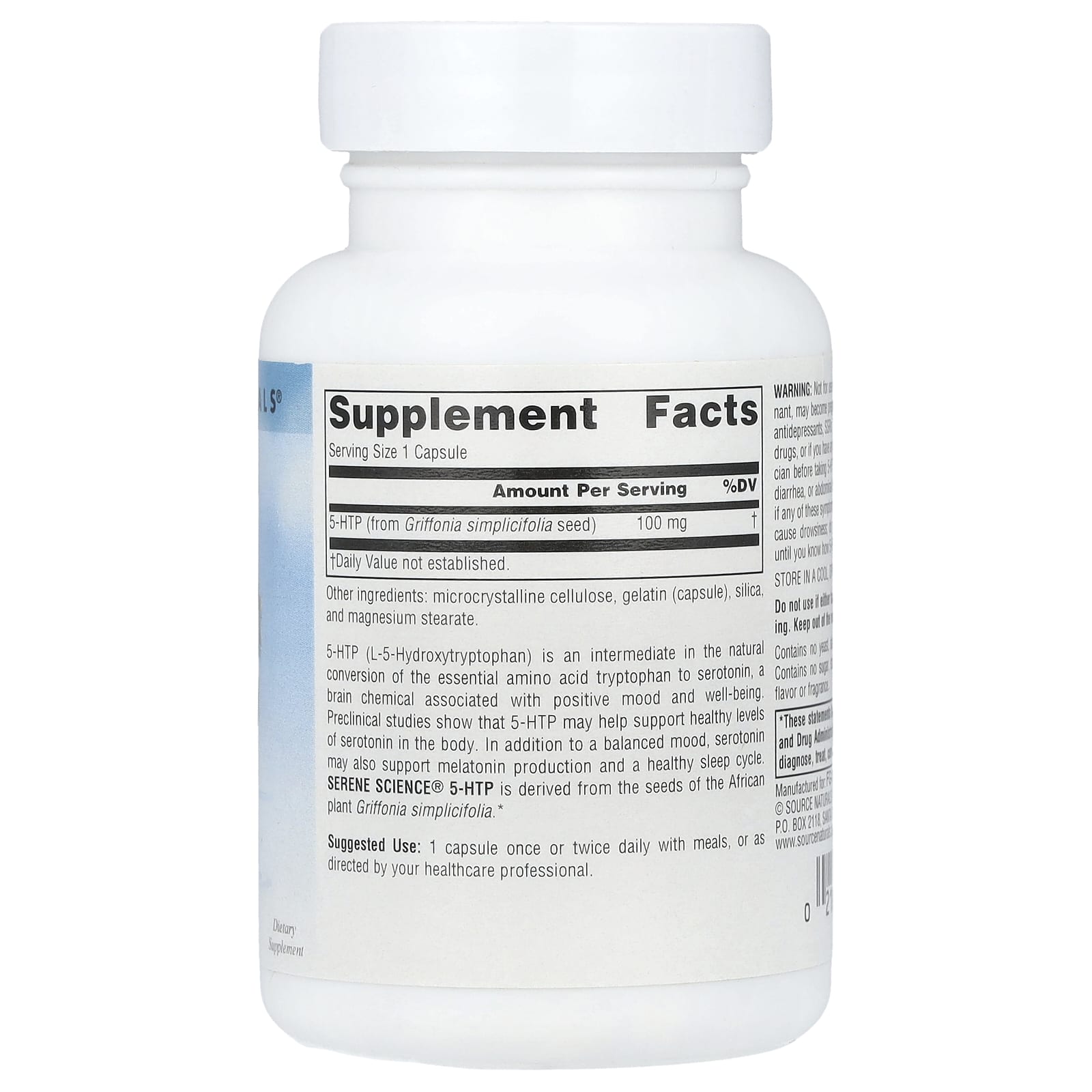 Не предназначено для детей, а также женщин, которые могут беременеть или кормить грудью. Если вы принимаете антидепрессанты, СИОЗС, ИМАО, седативные, болеутоляющие или другие препараты или страдаете каким-либо заболеванием, проконсультируйтесь с врачом, прежде чем принимать 5-HTP. У некоторых людей может возникать временная тошнота, диарея или дискомфорт в животе. Прекратите использование, если любой из этих симптомов сохраняется более трех дней. Может вызвать сонливость; не садитесь за руль и не используйте тяжелую технику, пока не узнаете, как 5-HTP влияет на вас.