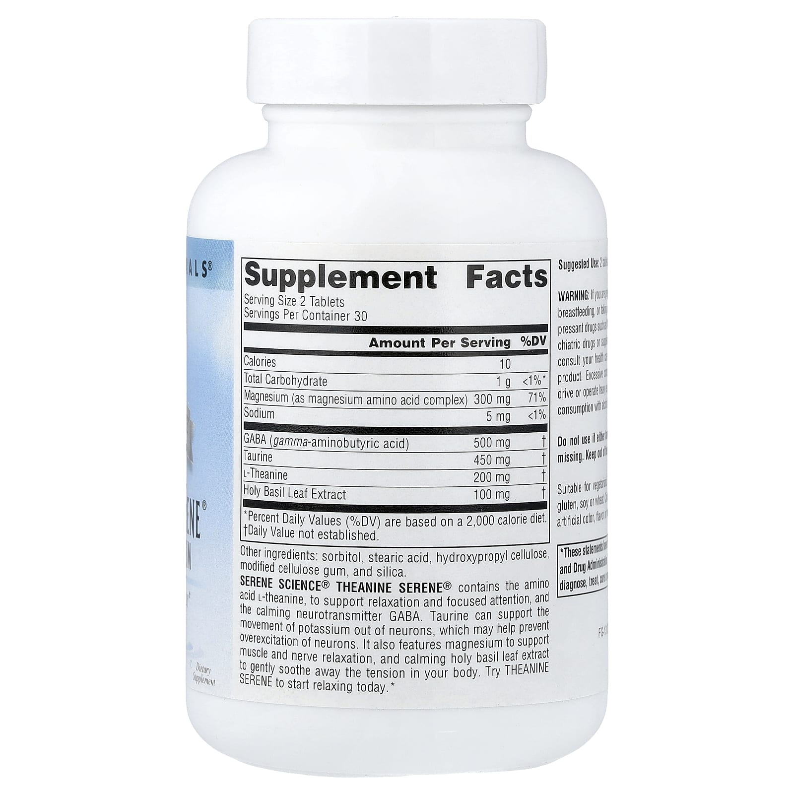 Theanine Serene® от Serene Science® содержит аминокислоту L-теанин, способствующую расслаблению при сохранении концентрации, а также успокаивающий нейромедиатор ГАМК. Таурин может способствовать выходу калия из нейронов, что помогает предотвратить перевозбуждение нейронов. Кроме того, он содержит магний для расслабления мышц и нервов и успокаивающий экстракт листьев базилика священного для мягкого снятия напряжения в теле. Добавка Theanine Serene поможет вам расслабиться.