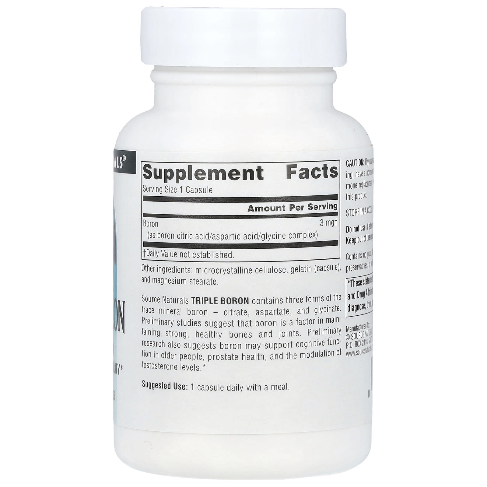 Source Naturals Triple Boron содержит три формы микроэлемента бора - цитрат, аспартат и глицинат. Предварительные исследования показывают, что бор играет важную роль в поддержании крепких и здоровых костей и суставов. Предварительные исследования также показывают, что бор может поддерживать когнитивные функции у пожилых людей, здоровье простаты и изменение уровня тестостерона.