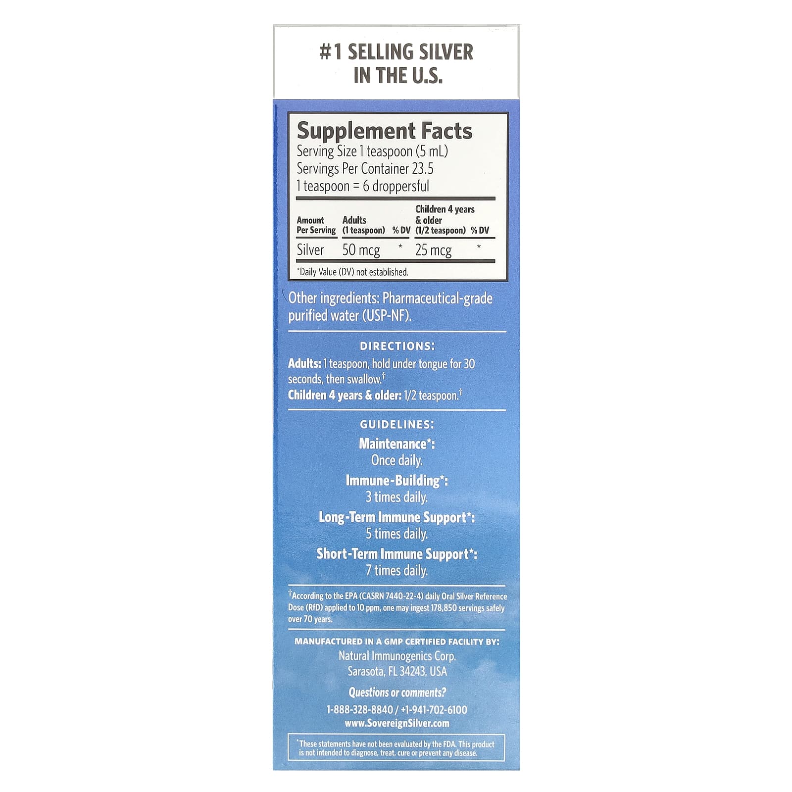 - Идеальная безопасность — формула Sovereign Silver разработана с учетом безопасности для всей семьи. Даже если вы будете принимать Sovereign Silver 7 раз в день на протяжении 70 лет, вы все равно не превысите суточную пероральную безопасную референтную дозу (Rfd) серебра, установленную EPA.†