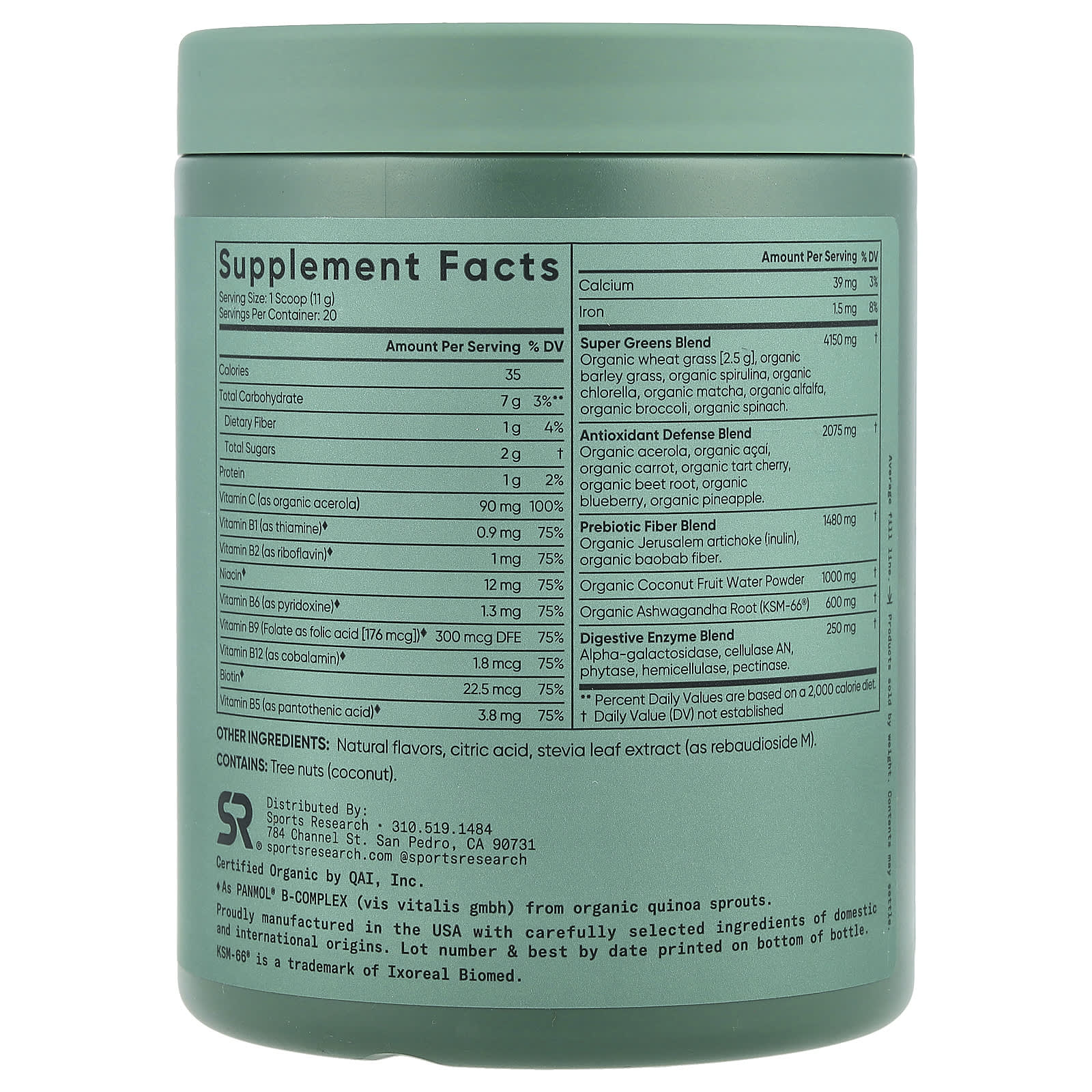 Органические ростки пшеницы [2,5 г], органические ростки ячменя, органическая спирулина, органическая хлорелла, органический матча, органическая люцерна, органическая брокколи, органический шпинат.