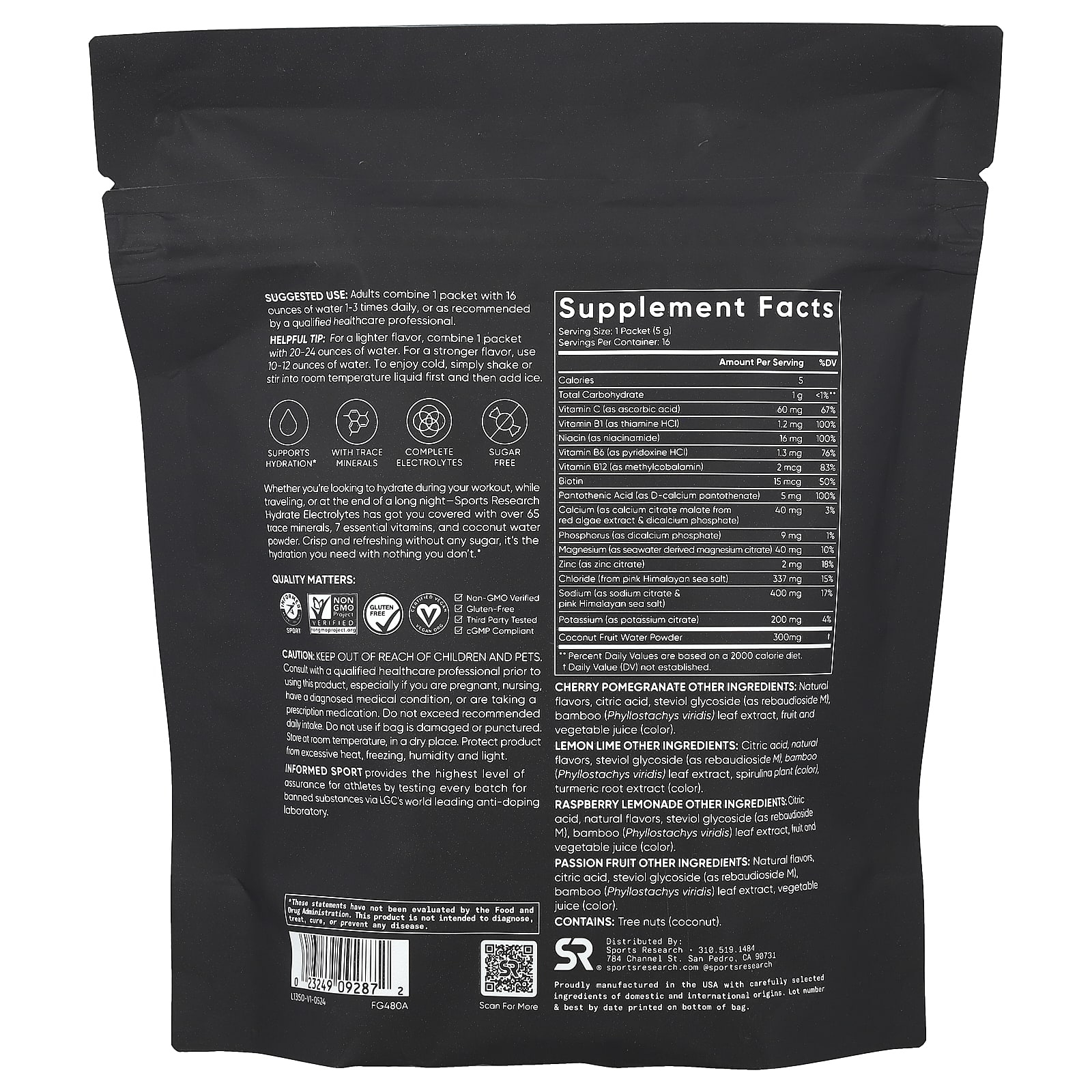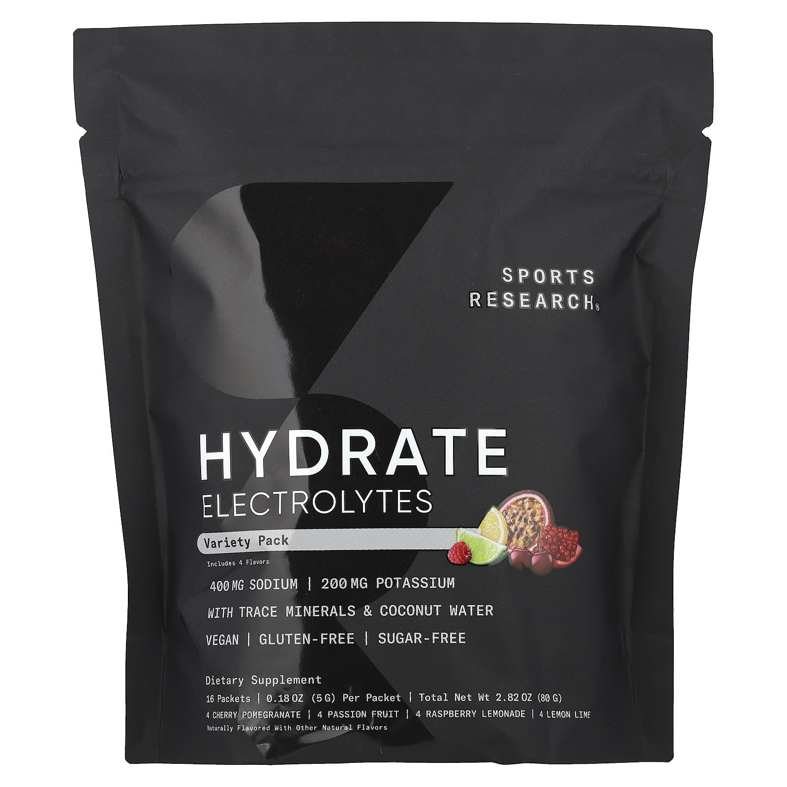 Если вы хотите восполнить водный баланс во время тренировки, в путешествии или в конце долгой ночи, Sports Research Hydrate Electrolytes предоставит вам более 65 микроэлементов, 7 незаменимых витаминов и порошок из кокосовой воды. Хрустящий и освежающий напиток без сахара - это необходимое увлажнение.