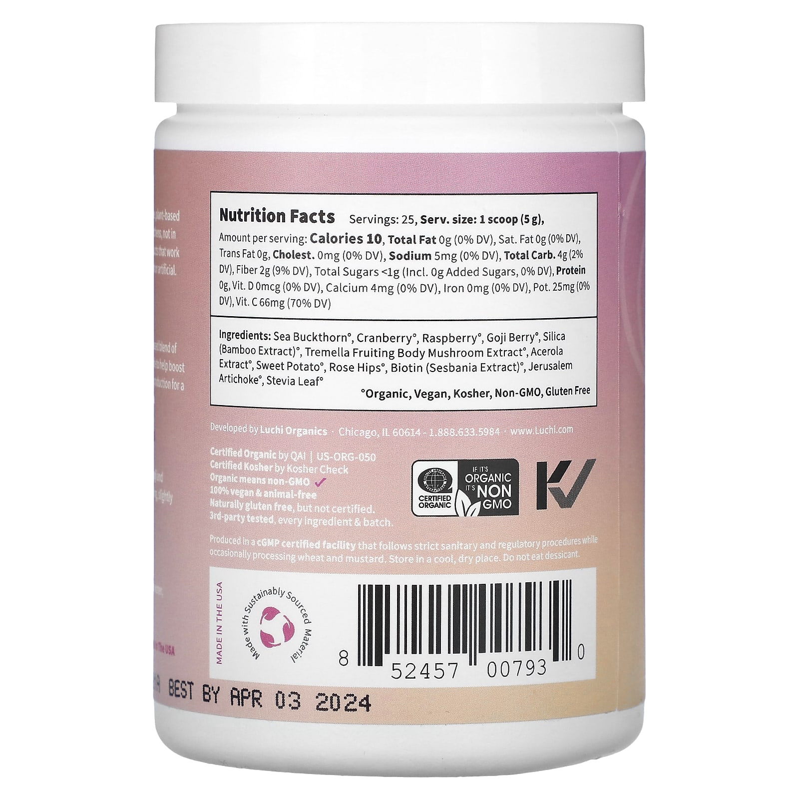 Органическая омолаживающая смесь тремеллы, бамбукового диоксида кремния, шиповника, биотина и многого другого способствует выработке коллагена.