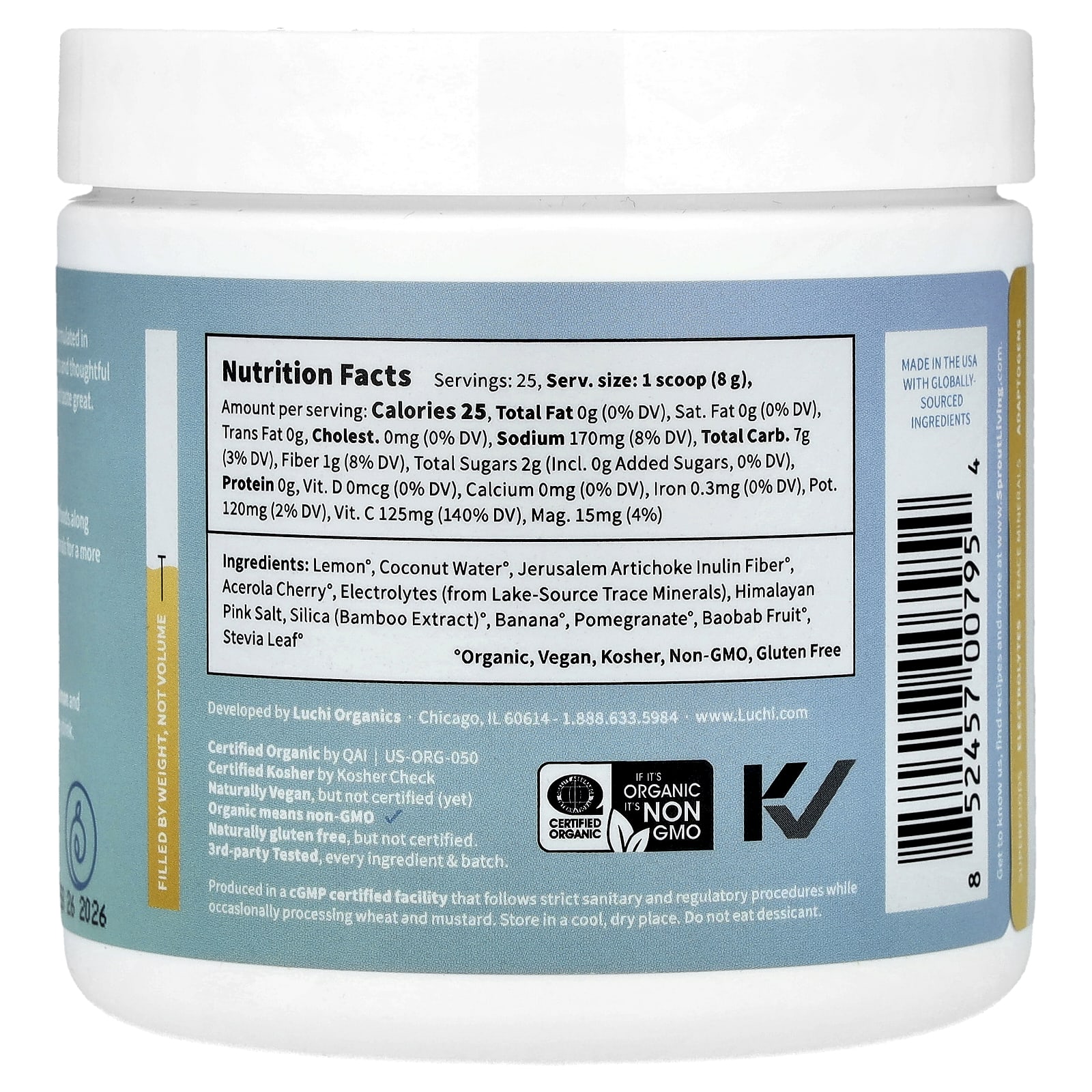 Кокосовая вода °, lemon°, гранат °, ацерола °, баобаб, семейная реликвия красный банан °, иерусалимский артишок °, натуральные электролиты, розовая гималайская соль, лист стевии °.