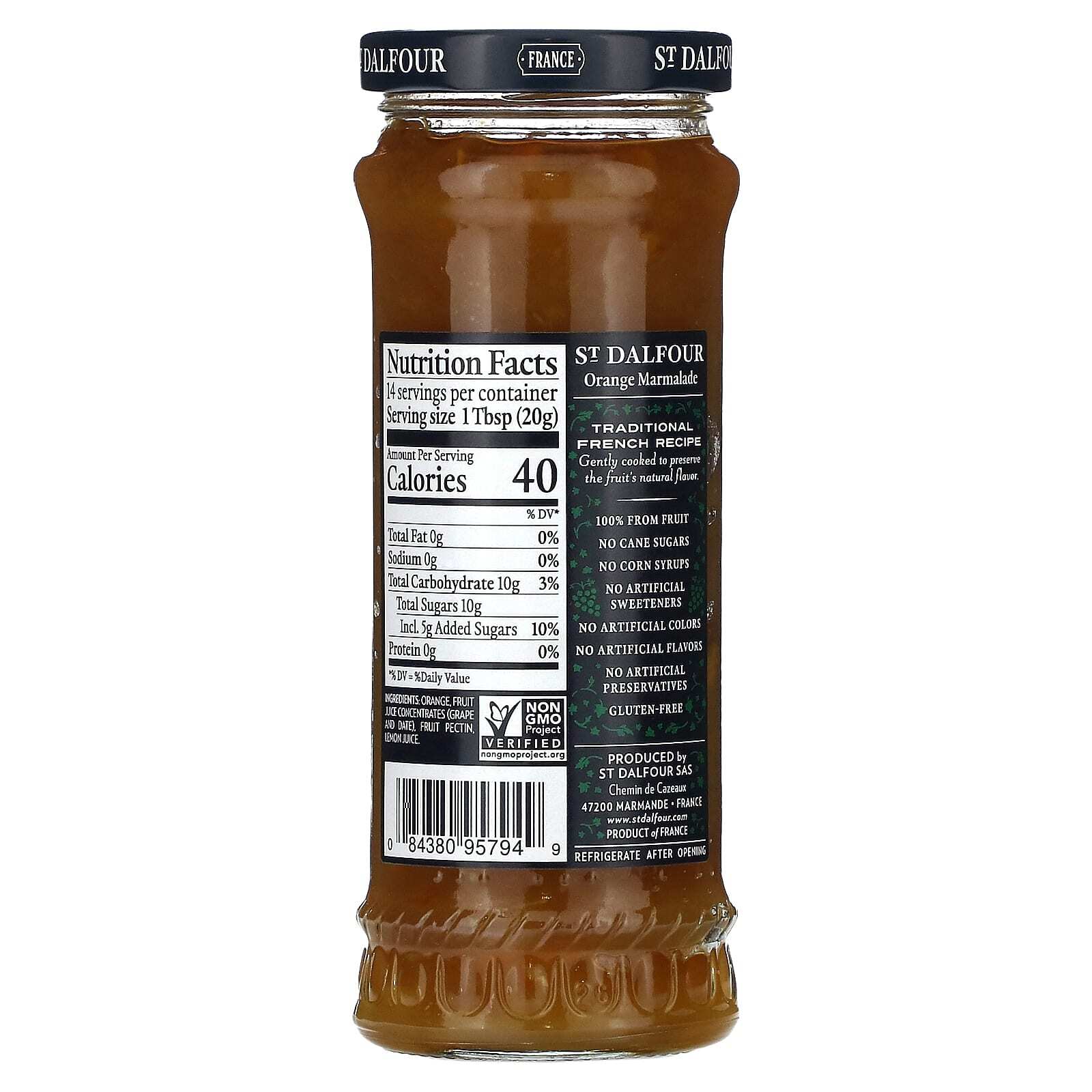 Вкусный фруктовый джем, сделанный во Франции по старинному рецепту. Апельсиновый мармелад с концентратом виноградного сока в качестве подсластителя.