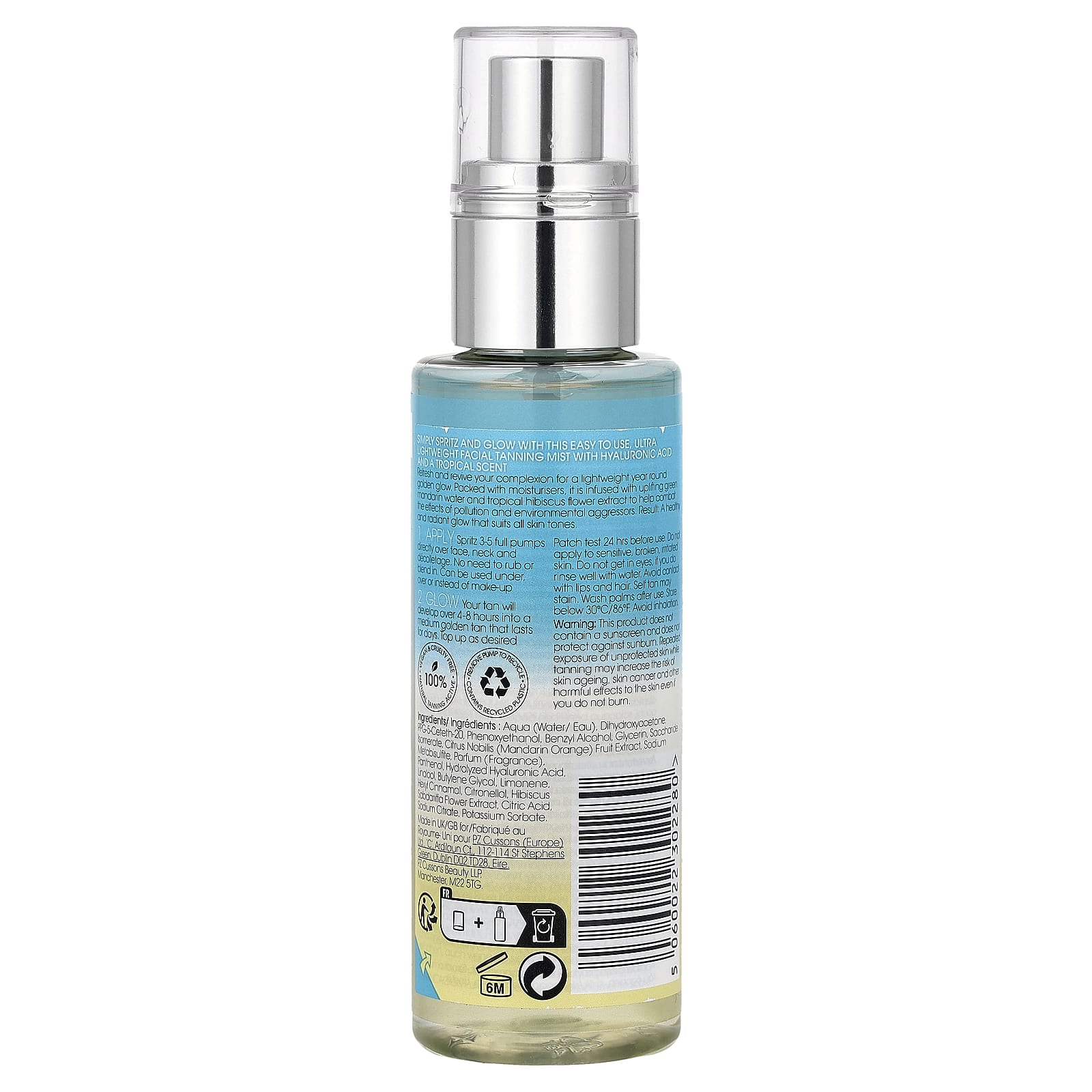 Просто нанесите этот простой в использовании сверхлегкий спрей для загара для лица с гиалуроновой кислотой и ароматом тропических фруктов и сияйте.