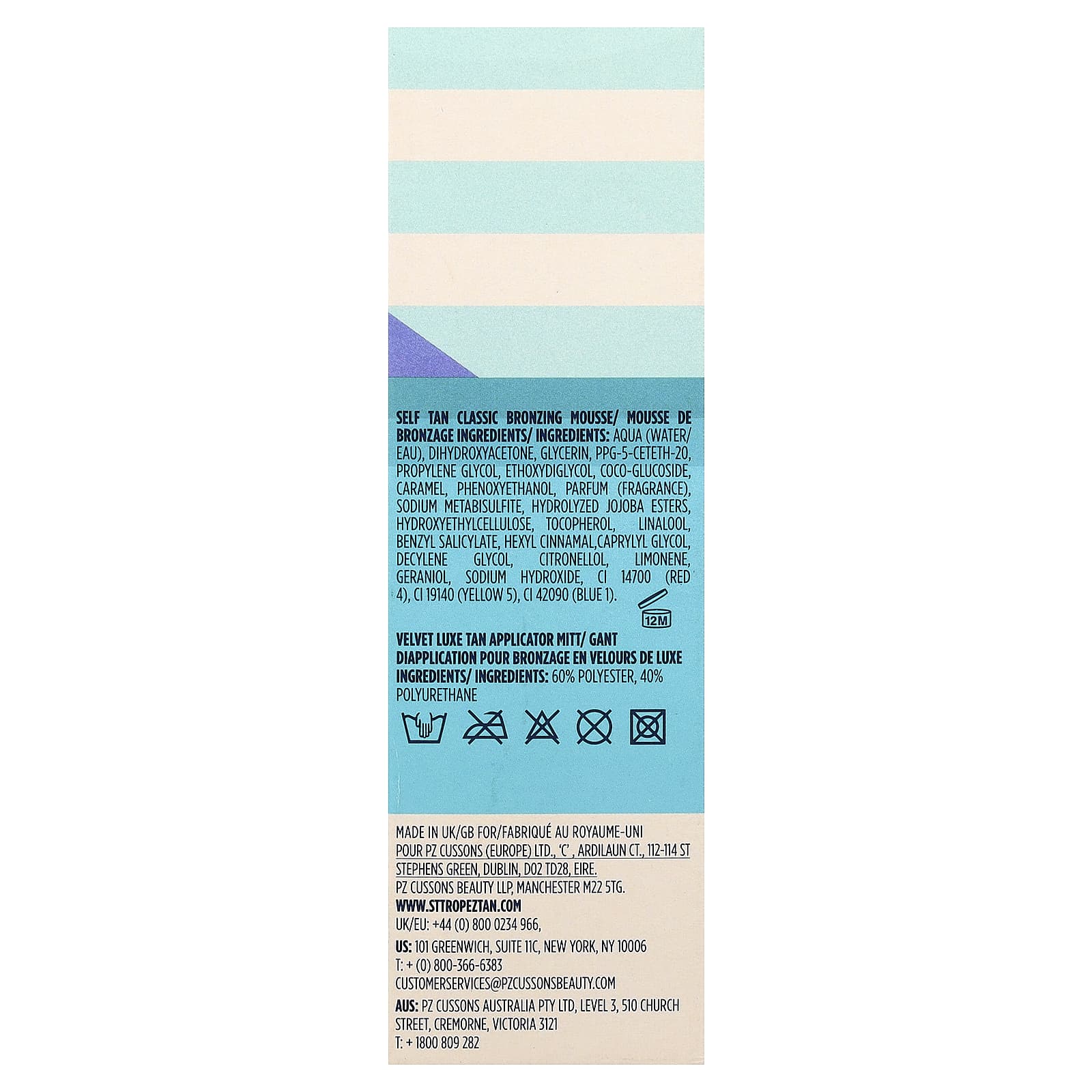 Классический мусс-бронзер для автозагара: Вода, дигидроксиацетон, глицерин, ППГ-5-цетет-20, пропиленгликоль, этоксидигликоль, кокоглюкозид, карамель, феноксиэтанол, парфюмерная композиция (отдушка), метабисульфит натрия, гидролизованные эфиры жожоба, гидроксиэтилцеллюлоза, токоферол, линалоол, бензилсалицилат, гексил циннамал, каприлилгликоль, дециленгликоль, цитронеллола, лимонен, гераниола, гидроксид натрия, краситель красный 4 (CI 14700), краситель желтый 5 (CI 19140), краситель синий 1 (CI 42090).