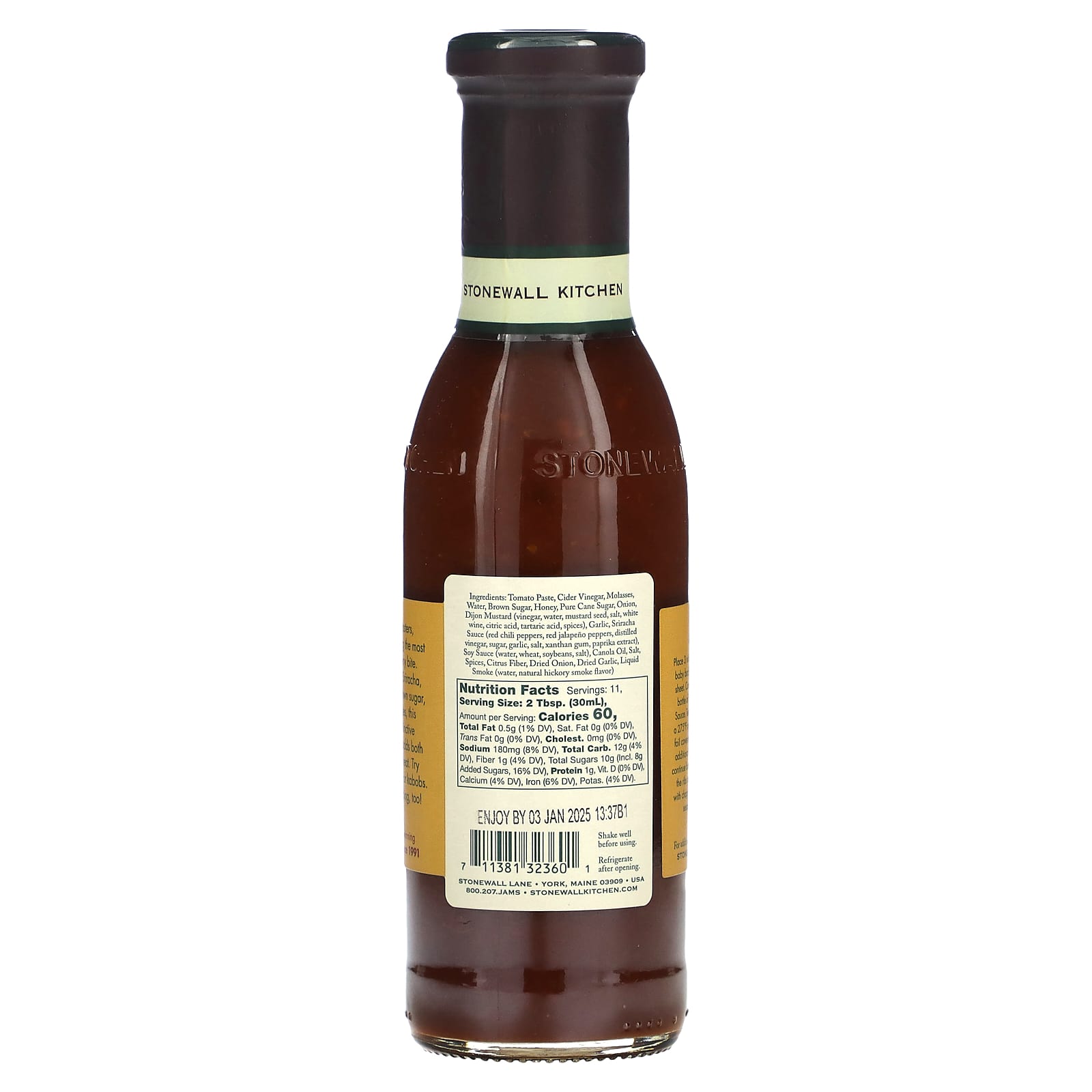 Tomato paste, cider vinegar, molasses, water, brown sugar, honey, pure cane sugar, onion, dijon mustard (vinegar, water, mustard seed, salt, white wine, citric acid, tartaric acid, spices), garlic, sriracha sauce (red chili peppers, red jalapeño peppers, distilled vinegar, sugar, garlic, salt, xanthan gum, paprika extract), soy sauce (water, wheat, soybeans, salt), canola oil, salt, spices, citrus fiber, dried onion, dried garlic, liquid smoke (water, natural hickory smoke flavor)