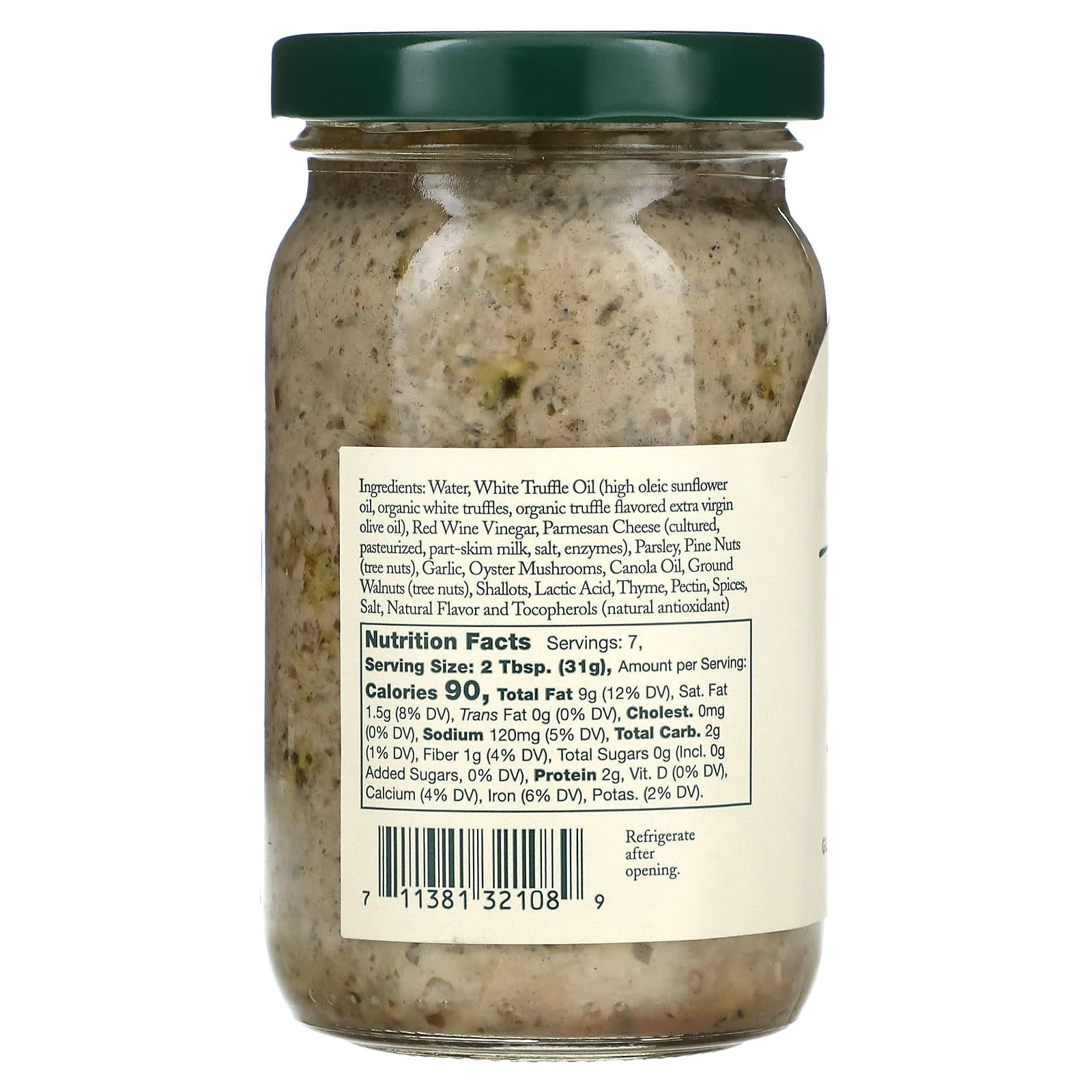 Вода, масло из белого трюфеля (высокоолеиновое подсолнечное масло, органические белые трюфели, органическое оливковое масло первого отжима со вкусом трюфеля), красный винный уксус, сыр пармезан (кислородный, пастеризованное, частично обезжиренное молоко, соль, ферменты), петрушка, кедровые орехи (древесные орехи), чеснок, вешенки, рапсовое масло, молотые грецкие орехи (древесные орехи), лук-шалот, молочной кислоты, чабрец, пектин, специи, соль, натуральный ароматизатор и токоферолы (натуральный антиоксидант).