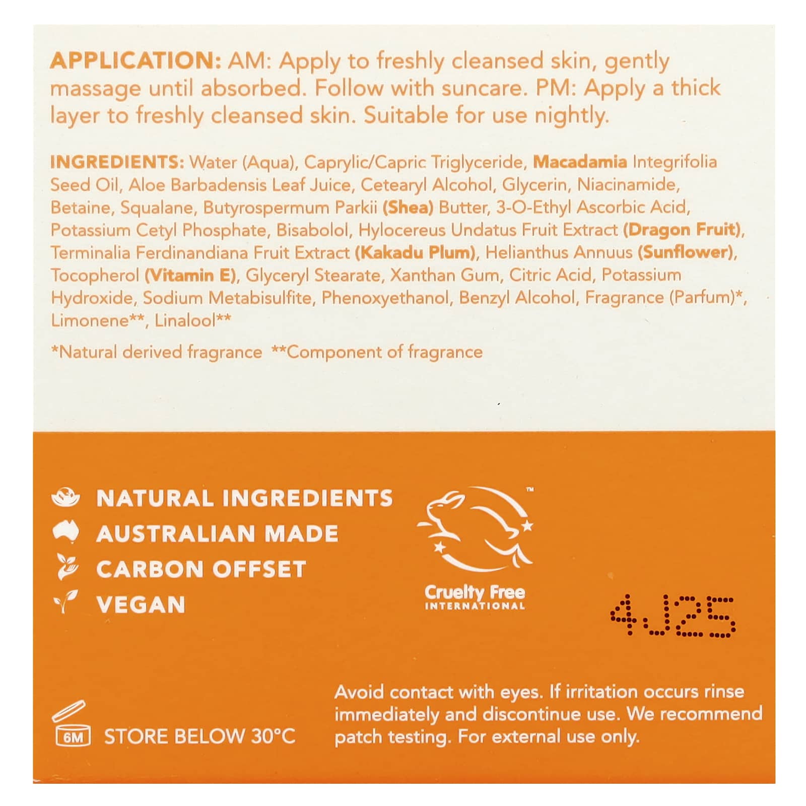 Вода, каприловый/каприновый триглицерид, масло макадамии (Macadamia integrifolia), сок из листьев алоэ вера (Aloe barbadensis), цетеариловый спирт, глицерин, никотинамид, бетаин, сквалан, масло ши (Butyrospermum parkii), 3-о-этил-аскорбиновая кислота, цетил фосфат калия, бисаболол, экстракт плодов дракона (hylocereus undatus), экстракт плодов сливы какаду (Terminalia ferdinandiana), подсолнечник (Helianthus annuus), токоферол (витамин E), глицерил стеарат, ксантановая камедь, лимонная кислота, гидроксид калия, метабисульфит натрия, феноксиэтанол, бензиловый спирт, отдушка (парфюмерная композиция)*, лимонен **, линалоол **.