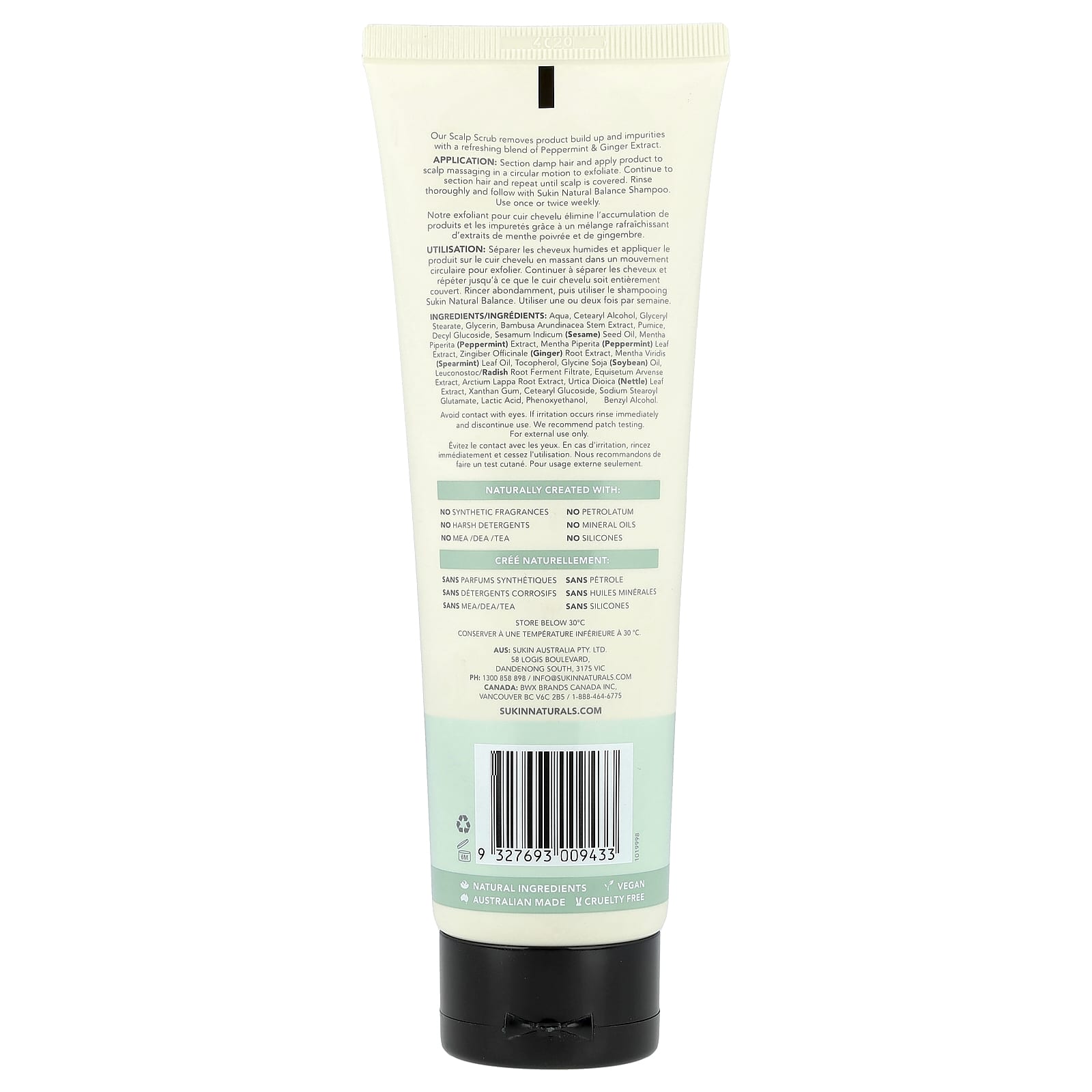 Применение: Разделите влажные волосы и нанесите средство на кожу головы, массируя круговыми движениями для отшелушивания. Продолжайте разделывать волосы и повторять, пока не покроете кожу головы. Тщательно смойте и нанесите шампунь Sukin Natural Balance. Используйте один или два раза в неделю.