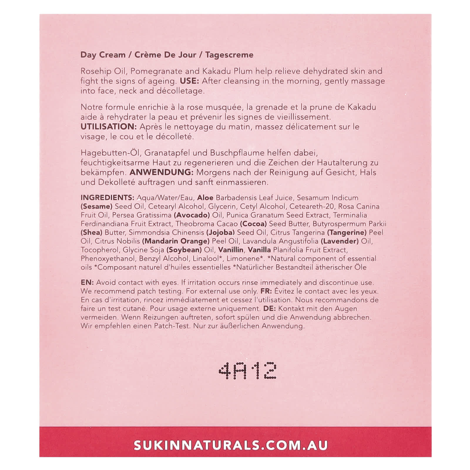 Вода (Aqua/eau), сок из листьев алоэ вера (Aloe barbadensis), кунжутное масло (Sesamum indicum), цетеариловый спирт, глицерин, цетиловый спирт, цетеарет-20, масло шиповника (Rosa canina), масло авокадо (Persea gratissima), экстракт косточек граната (Punica granatum), экстракт плодов сливы какаду (Terminalia ferdinandiana), масло из зёрен какао (Theobroma cacao), масло ши (Butyrospermum parkii), масло из семян жожоба (Simmondsia chinensis), масло из цедры мандарина (Citrus tangerina), масло из цедры мандарина (Citrus nobilis), лавандовое масло (Lavandula angustifolia), токоферол, соевое масло (Glycine soja), ванилин, экстракт ванили (Vanilla planifolia), феноксиэтанол, бензиловый спирт, линалоол*, лимонен*.