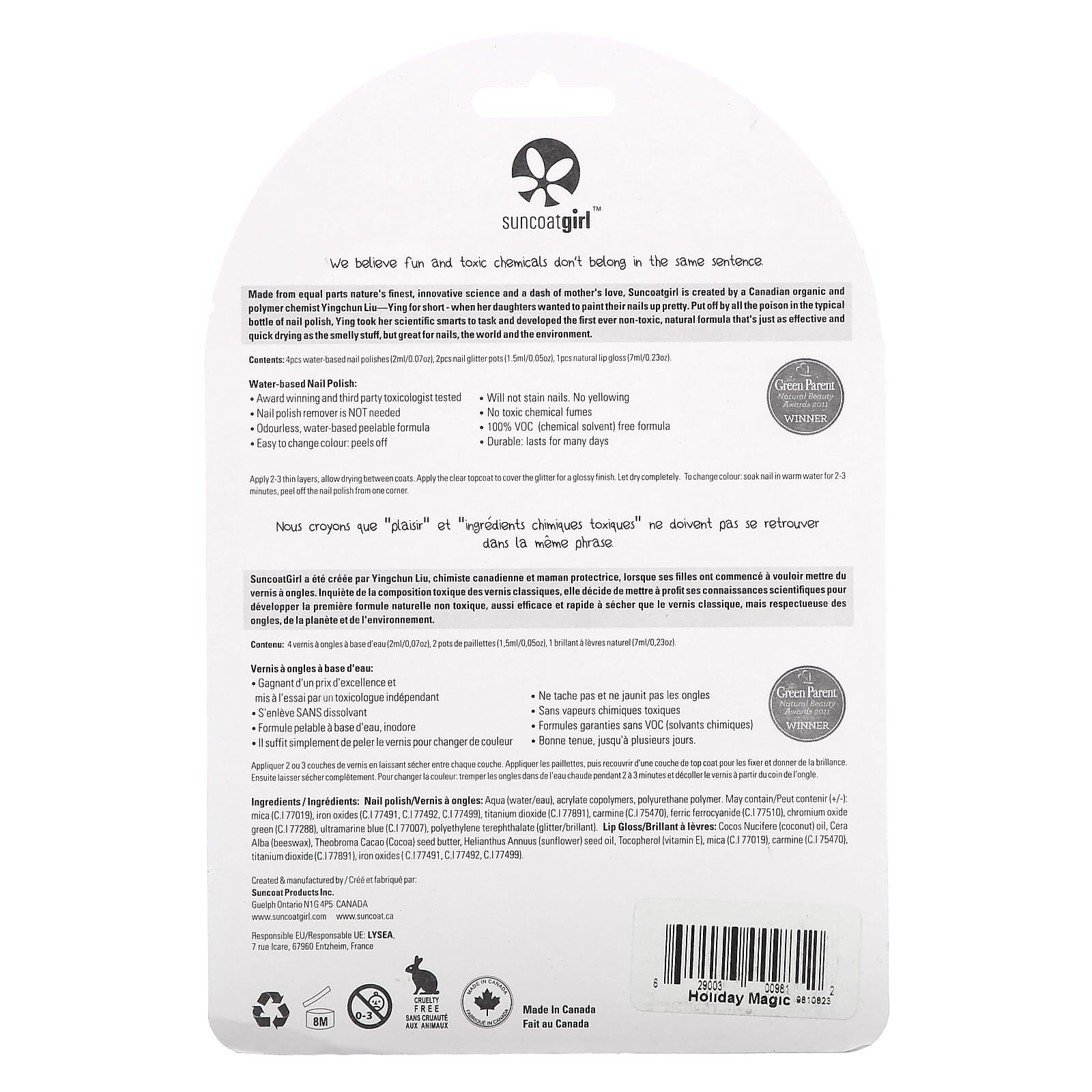 Созданный в равном соотношении лучшими природными, инновационными научными данными и капелькой материнской любви, крем Suncoatgirl был создан канадским химиком по органическим и полимерам Yingchun Liu-Ying для того, чтобы ее дочки хотели красиво накрасить ногти. Отвергнув яд, содержащийся в обычном флаконе лака для ногтей, Ин воспользовалась своими научными данными и разработала первую в мире нетоксичную натуральную формулу, которая так же эффективна и быстро высыхает, как и вонючие средства, но отлично подходит для ногтей, мире и окружающей среде.