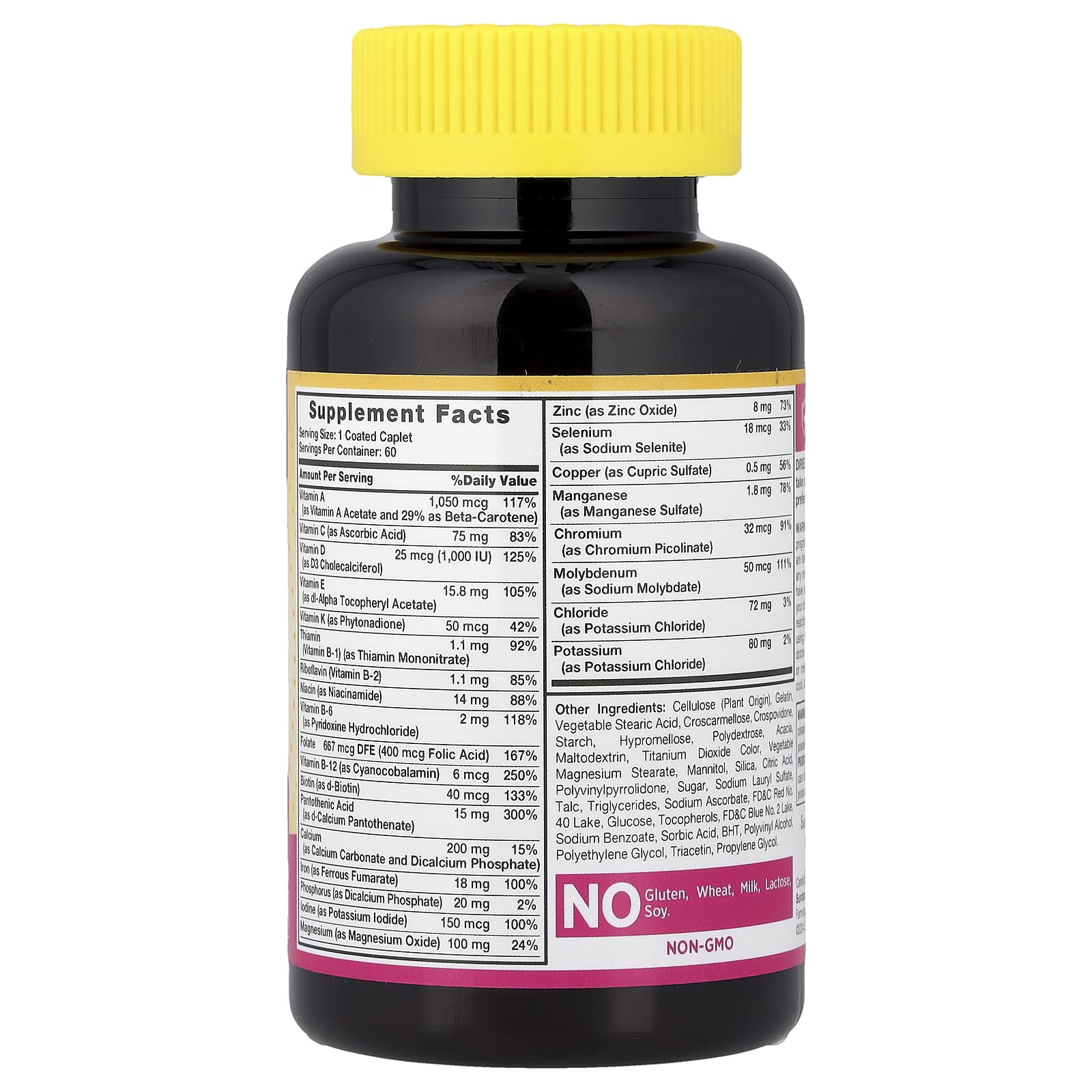 Целлюлоза (растительного происхождения), желатина, растительная стеариновая кислота, кроскармеллоза, кросповидон, крахмал, гипромеллоза, мальтодекстрин, аравийская камедь, полидекстроза, диоксид титана (краситель), стеарат магния растительного происхождения, диоксид кремния, маннит, лимонная кислота, лаурилсульфата натрия, поливинилпирролидон, сахароза, триглицериды, триацетин, пропиленгликоль, аскорбат натрия, FD&C красный 40 озеро, глюкоза, токоферолы, FD&C синий № 2 озера, бензоат натрия, сорбиновая кислота, бутилгидрокситолуол, тальк.