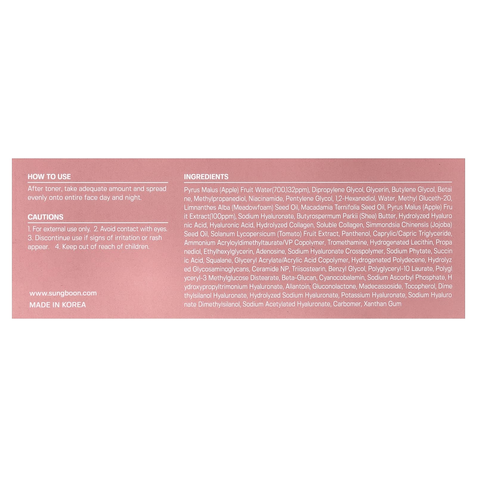 яблочная соковая вода (Pyrus malus) (700 132 част./млн), дипропиленгликоль, глицерин, бутиленгликоль, бетаин, метилпропандиол, никотинамид, пентилен гликоль, 1,2-гександиол, вода, метил глюцет-20, масло из семян пенника лугового (Limnanthes alba), масло макадамии (Macadamia ternifolia), экстракт плодов яблока (Pyrus malus) (100 част./млн), гиалуронат натрия, масло ши (Butyrospermum parkii), гидролизованная гиалуроновая кислота, гиалуроновая кислота, гидролизованный коллаген, растворимый коллаген, масло из семян жожоба (Simmondsia chinensis), экстракт плодов томата (Solanum lycopersicum), пантенол, каприловый/каприновый триглицерид, аммоний акрилоилдиметилтаурат/ВП сополимер, трометамин, гидрогенизированный лецитин, пропандиол, этилгексилглицерин, аденозин, кроссполимер гиалуроната натрия, фитат натрия, янтарная кислота, сквалан, сополимер глицерил акрилата/акриловой кислоты, гидрогенизированный полидецен, гидролизованные гликозаминогликаны, керамид NP, триизостеарин, бензилгликоль, полиглицерил-10 лаурат, полиглицерил-3 метилглюкозы дистеарат, бета-глюкан, цианокобаламин, аскорбил фосфат натрия, гиалуронат гидроксипропилтримония, аллантоин, глюконолактон, мадекассосид, токоферол, диметилсиланол гиалуронат, гидролизованный гиалуронат натрия, гиалуронат калия, гиалуронат натрия диметилсиланол, ацетилированный гиалуронат натрия, карбомер, ксантановая камедь.