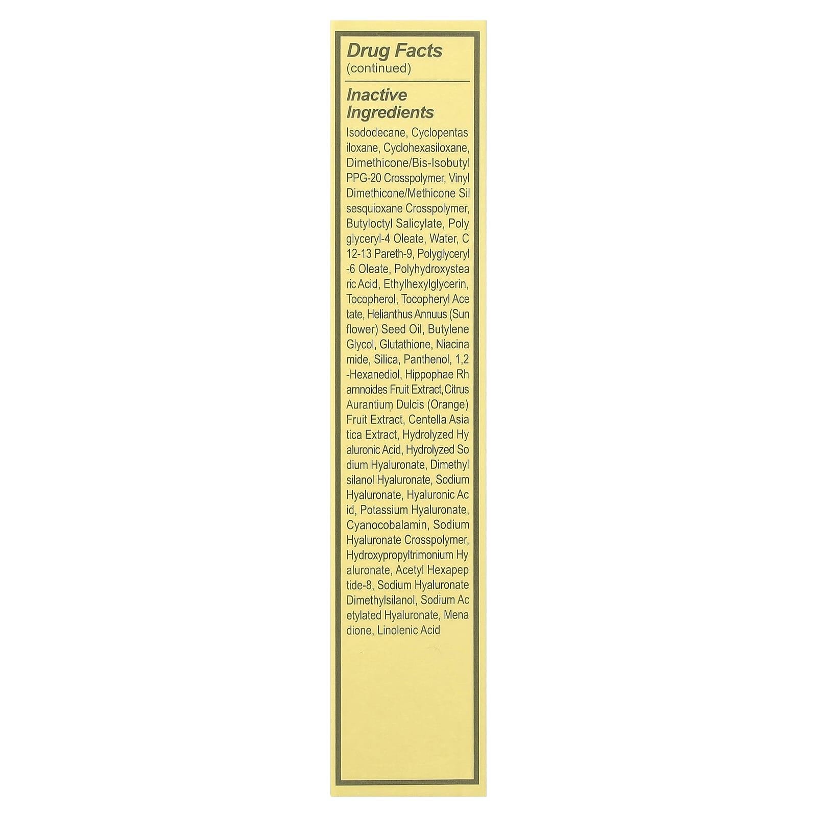 | изододекан, циклопентасилоксан, циклогексасилоксан, диметикон/бис-изобутил ППГ-20 кроссполимер, винил диметикон/метикон силсесквиоксан, бутилоктил салицилат, полиглицерил-4 олеат, вода, c 12-13 парет-9, полиглицерил-6-олеат, полигидроксистеариновая кислота, этилгексилглицерин , токоферол, токоферилацетат, масло семян подсолнечника (Helianthus annuus), бутиленгликоль, глутатион, никотинамид, диоксид кремния, пантенол, 1,2-гександиол, экстракт плодов облепихи (Hippophae rhamnoides), экстракт плодов апельсина (Citrus aurantium dulcis), экстракт готу колы (Centella asiatica), гидролизованная гиалуроновая кислота, гидролизованный гиалуронат натрия, диметилсиланол гиалуронат, гиалуронат натрия, гиалуроновая кислота, гиалуронат калия, цианокобаламин, кроссполимер гиалуроната натрия, гиалуронат гидроксипропилтримония, ацетил гексапептид-8, гиалуронат натрия диметилсиланол, ацетилированный гиалуронат натрия, менадион. | |
