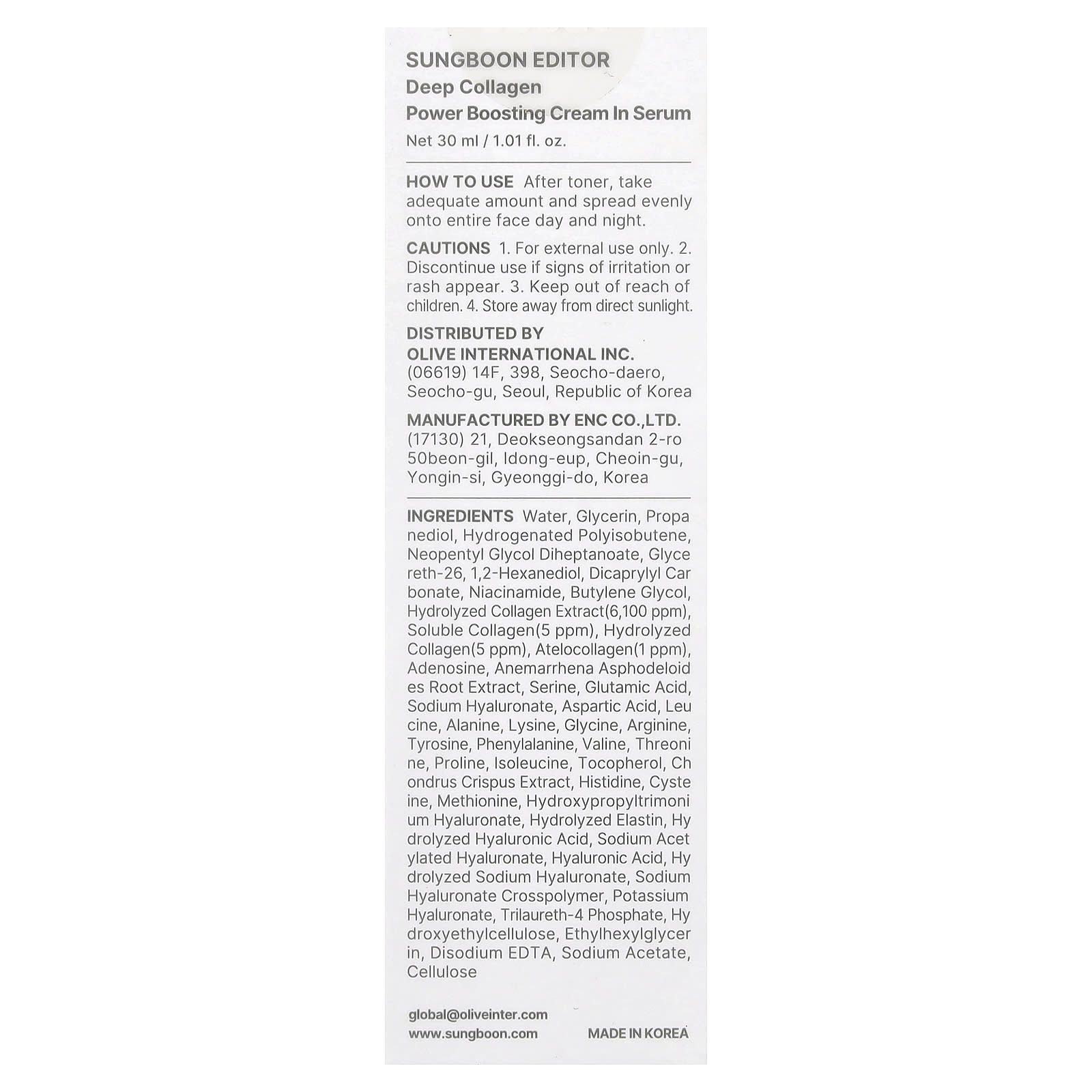Вода, глицерин, пропандиол, гидрогенизированный полиизобутен, неопентилгликоль дигептаноат, глицерет-26, 1,2-гександиол, дикаприлил карбонат, никотинамид, бутиленгликоль, экстракт гидролизованного коллагена (6100 част./млн), растворимый коллаген (5 част./млн), гидролизованный коллаген (5 част./млн), ателоколлаген (1 част./млн), аденозин, экстракт корня анемаррены асфоделевой (Anemarrhena asphodeloides), серин, глутаминовая кислота, гиалуронат натрия, аспарагиновая кислота, лейцин, аланин, лизин, глицин, аргинин, тирозин, фенилаланин, валин, треонин, пролин, изолейцин, токоферол, экстракт ирландского мха (Chondrus crispus), гистидин, цистеин, метионина, гиалуронат гидроксипропилтримония, гидролизованный эластин, гидролизованная гиалуроновая кислота, ацетилированный гиалуронат натрия, гиалуроновая кислота, гидролизованный гиалуронат натрия, кроссполимер гиалуроната натрия, гиалуронат калия, трилаурет-4-фосфат, гидроксиэтилцеллюлоза, этилгексилглицерин, двунатриевая ЭДТК, ацетат натрия, целлюлоза.