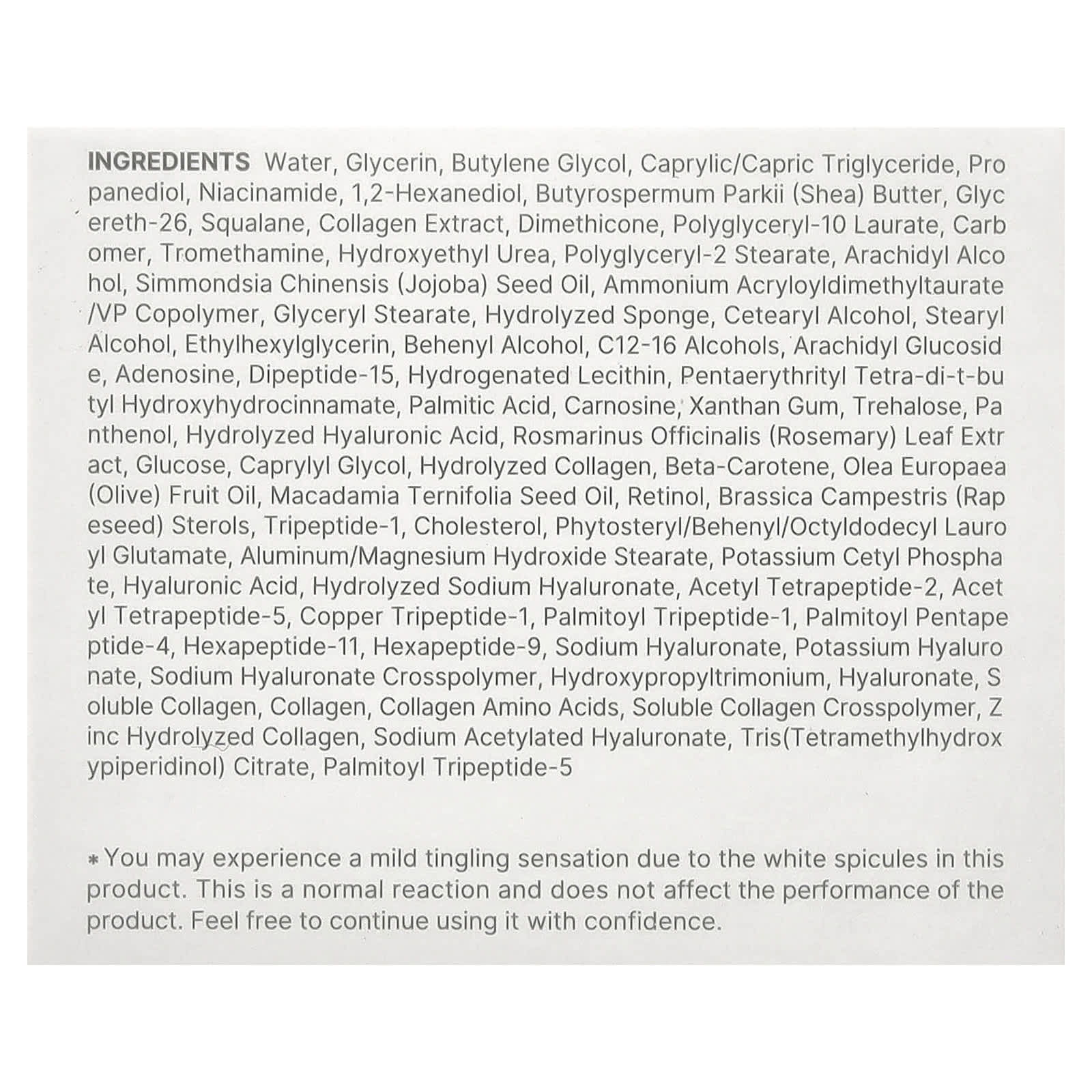 Вода, глицерин, бутиленгликоль, каприловый/каприновый триглицерид, пропандиол, никотинамид, 1,2-гександиол, масло ши (Butyrospermum parkii), глицерет-26, сквалан, экстракт коллагена, диметикон, полиглицерил-10 лаурат, карбомер, трометамин, гидроксиэтилированная мочевина, полиглицерил-2 стеарат, арахидиловый спирт, масло из семян жожоба (Simmondsia chinensis), аммоний акрилоилдиметилтаурат/ВП сополимер, глицерил стеарат, гидролизованная губка, цетеариловый спирт, стеариловый спирт, этилгексилглицерин, бегениловый спирт, c12-16 спирты, арахидиловый глюкозид, аденозин, дипептид-15, гидрогенизированный лецитин, пентаэритритил тетра-ди-трет-бутил гидроксигидроциннамат, пальмитиновая кислота, карнозина, ксантановая камедь, трегалоза, пантенол, гидролизованная гиалуроновая кислота, экстракт листьев розмарина (Rosmarinus officinalis), глюкоза, каприлилгликоль, гидролизованный коллаген, бета-каротин, оливковое масло (Olea europaea), масло макадамии (Macadamia ternifolia), ретинол, рапсовые стеролы (Brassica campestris), трипептид-1, холестерина, фитостерил/бегенил/октилдодецил лауроил глутамат, стеарат гидроксида алюминия/магния, цетил фосфат калия, гиалуроновая кислота, гидролизованный гиалуронат натрия, ацетил тетрапептид-2, ацетил тетрапептид-5, меди трипептид-1, пальмитоил трипептид-1, пальмитоил пентапептид-4, гексапептид-11, гексапептид-9, гиалуронат натрия, гиалуронат калия, кроссполимер гиалуроната натрия, гидроксипропилтримоний, гиалуронат, растворимый коллаген, коллаген, коллагеновые аминокислоты, растворимый коллаген кроссполимер, гидролизованный цинком коллаген, ацетилированный гиалуронат натрия, трис(тетраметилгидроксипиперидинол) цитрат, пальмитоил трипептид-5.