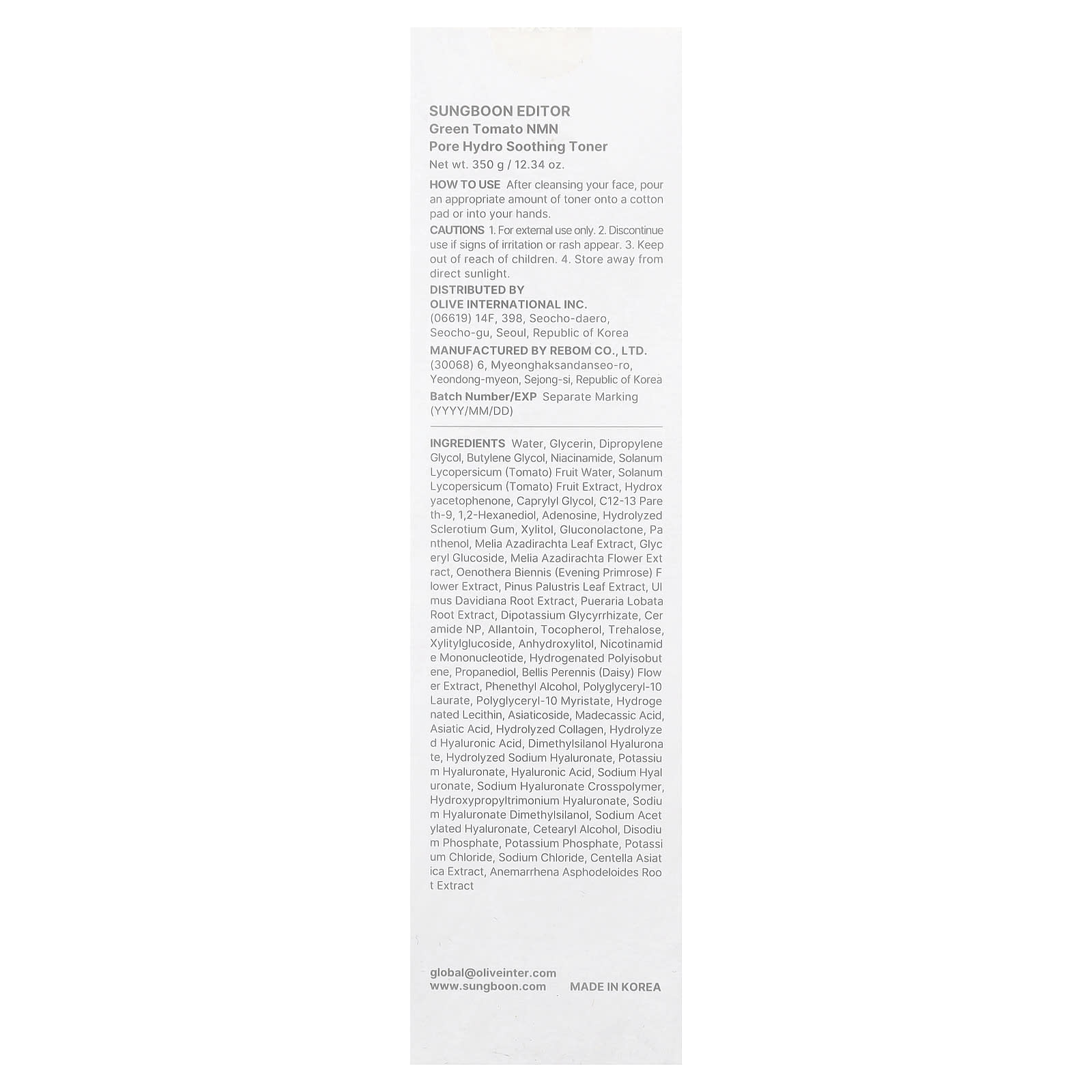 Вода, глицерин, дипропиленгликоль, бутиленгликоль, никотинамид, соковая вода из плодов томата (Solanum lycopersicum), экстракт плодов томата (Solanum lycopersicum), гидроксиацетофенон, каприлилгликоль, c12-13 парет-9,1,2-гександиол, аденозин, гидролизованная камедь склероций, ксилитол, глюконолактон, пантенол, экстракт листьев дерева ним (Melia azadirachta), глицерил глюкозид, экстракт цветков дерева ним (Melia azadirachta), экстракт цветков примулы вечерней (Oenothera biennis), экстракт хвои сосны болотной (Pinus palustris), экстракт корня нима (Uimus davidiana), экстракт корней пуэрарии дольчатой (Pueraria lobata), дикалия глицирризат, керамид NP, аллантоин, токоферол, трегалоза, ксилитилглюкозид, ангидроксилитол, никотинамид мононуклеотид, гидрогенизированный полиизобутен, пропандиол, экстракт цветков маргаритки многолетней (Bellis perennis), фенетиловый спирт, полиглицерил-10 лаурат, полиглицерил-10 миристат, гидрогенизированный лецитин, азиатикозид, мадекассовая кислота, азиатиковая кислота, гидролизованный коллаген, гидролизованная гиалуроновая кислота, диметилсиланол гиалуронат, гидролизованный гиалуронат натрия, гиалуронат калия, гиалуроновая кислота, гиалуронат натрия, кроссполимер гиалуроната натрия, гиалуронат гидроксипропилтримония, гиалуронат натрия диметилсиланол, ацетилированный гиалуронат натрия, цетеариловый спирт, динатрия фосфат, фосфат калия, хлорид калия, хлорид натрия, экстракт готу колы (Centella asiatica), экстракт корня анемаррены асфоделевой (Anemarrhena asphodeloides).