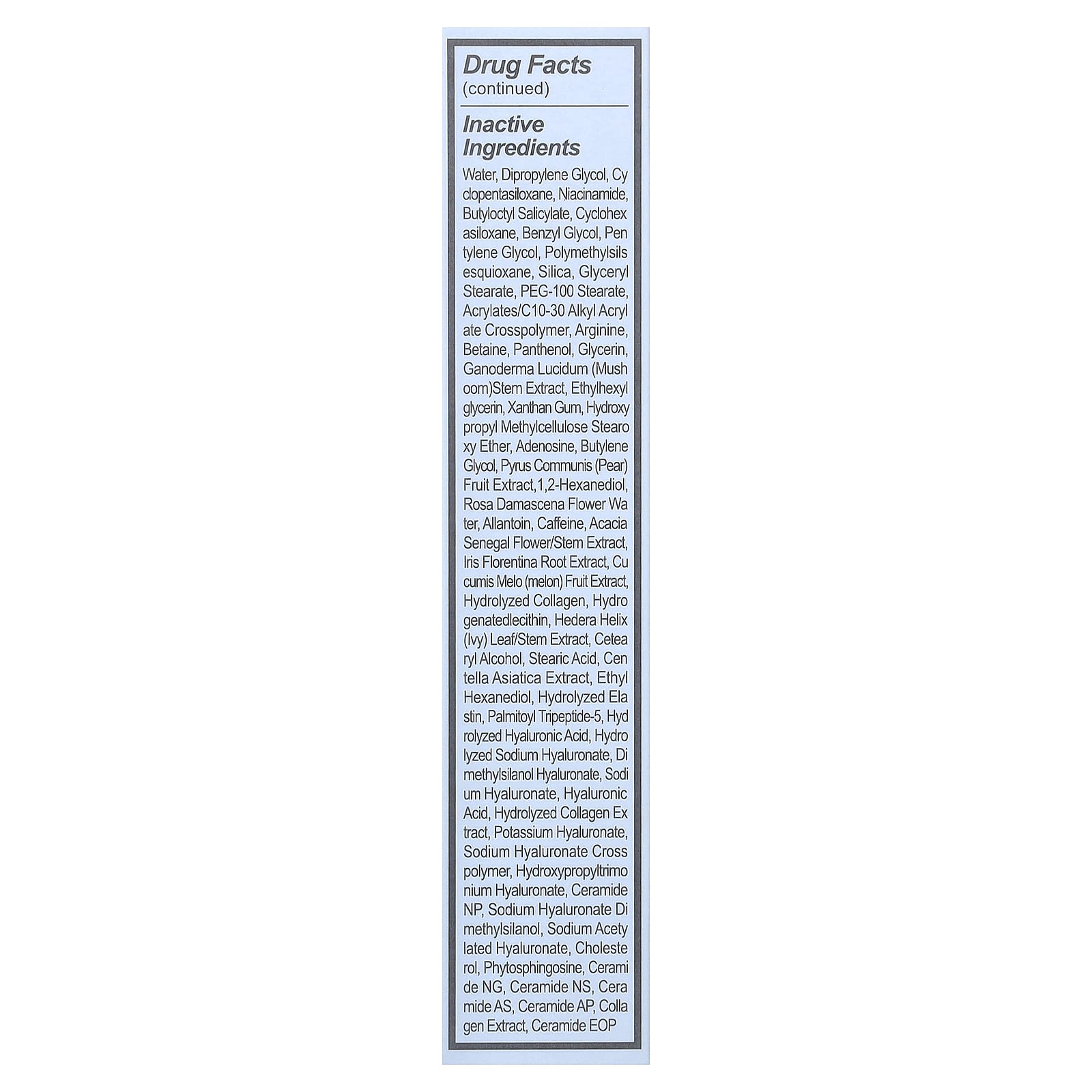 | вода, дипропиленгликоль, циклопентасилоксан, никотинамид, бутилоктил салицилат, циклогексасилоксан, бензилгликоль, пентилен гликоль, полиметилсилсесквиоксан, диоксид кремния, глицерил стеарат, ПЭГ-100 стеарат, акрилат/c10-30 алкил акрилат кроссполимер, аргинин, бетаин, пантенол, глицерин, ганодерма экстракт стеблей гриба (Lucidum), этилгексилглицерин, ксантановая камедь, гидроксипропилметилцеллюлоза стеароксиэфир, аденозин, бутиленгликоль, экстракт плодов груши (Pyrus communis), 1,2-гександиол, вода из цветков дамасской розы (Rosa damascena), аллантоин, кофеин, акация сенегальская экстракт цветков и стеблей, экстракт корня ириса флорентина, экстракт плодов дыни, гидролизованный коллаген, гидрогенизированный лецитин, экстракт листьев и стеблей плюща, цетеариловый спирт, стеариновая кислота, экстракт готу колы (Centella asiatica), этил гександиол, гидролизованный эластин, пальмитоил трипептид-5, гидролизованная гиалуроновая кислота, гидролизованный гиалуронат натрия, диметилсиланол гиалуронат, гиалуронат натрия, гиалуроновая кислота, гидролизованный коллаген тракте, гиалуронат калия, кроссполимер гиалуроната натрия, гиалуронат гидроксипропилтримония, керамид NP, гиалуронат натрия диметилсиланол, ацетилированный гиалуронат натрия, холестерин, фитосфингозин, керамид NG, керамид NS, керамид as, керамид AP, экстракт коллагена, керамид EOP. | |