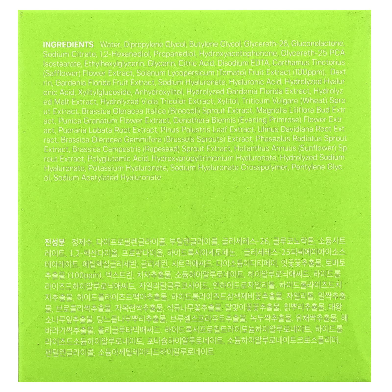 Вода, дипропиленгликоль, бутиленгликоль, глицерет-26, глюконолактон, цитрат натрия, 1,2-гександиол, пропандиол, гидроксиацетофенон, глицерет-25 PCA изостеарат, этилгексилглицерин, глицерин, лимонная кислота, двунатриевая ЭДТК, экстракт цветков сафлора (Carthamus tinctorius), экстракт плодов томата (Solanum lycopersicum) (100 част. / млн), декстрин, экстракт плодов гардении жасминовидной (Gardenia florida), гиалуронат натрия, гиалуроновая кислота, гидролизованная гиалуроновая кислота, ксилитилглюкозид, ангидроксилитол, гидролизованный экстракт гардении флоридской, гидролизованный солодовый экстракт, гидролизованный экстракт фиалки трехцветной, ксилитол, экстракт ростков пшеницы (Triticum vulgare), экстракт ростков брокколи (Brassica oleracea italica), экстракт почек магнолии, лилифлоры, экстракт цветков Punica granatum, экстракт цветков примулы вечерней (Oenothera biennis), экстракт корней пуэрарии дольчатой (Pueraria lobata), экстракт хвои сосны болотной (Pinus palustris), экстракт корня вяза Давида (Ulmus davidiana), экстракт брюссельской капусты (Brassica oleracea gemmifera), экстракт ростков Phaseolus radiatus, экстракт ростков рапса (Brassica campestris), экстракт ростков подсолнечника (Helianthus annuus), полиглутаминовая кислота, гиалуронат гидроксипропилтримония, гидролизованный гиалуронат натрия, гиалуронат калия, кроссполимер гиалуроната натрия, пентилен гликоль, ацетилированный гиалуронат натрия.