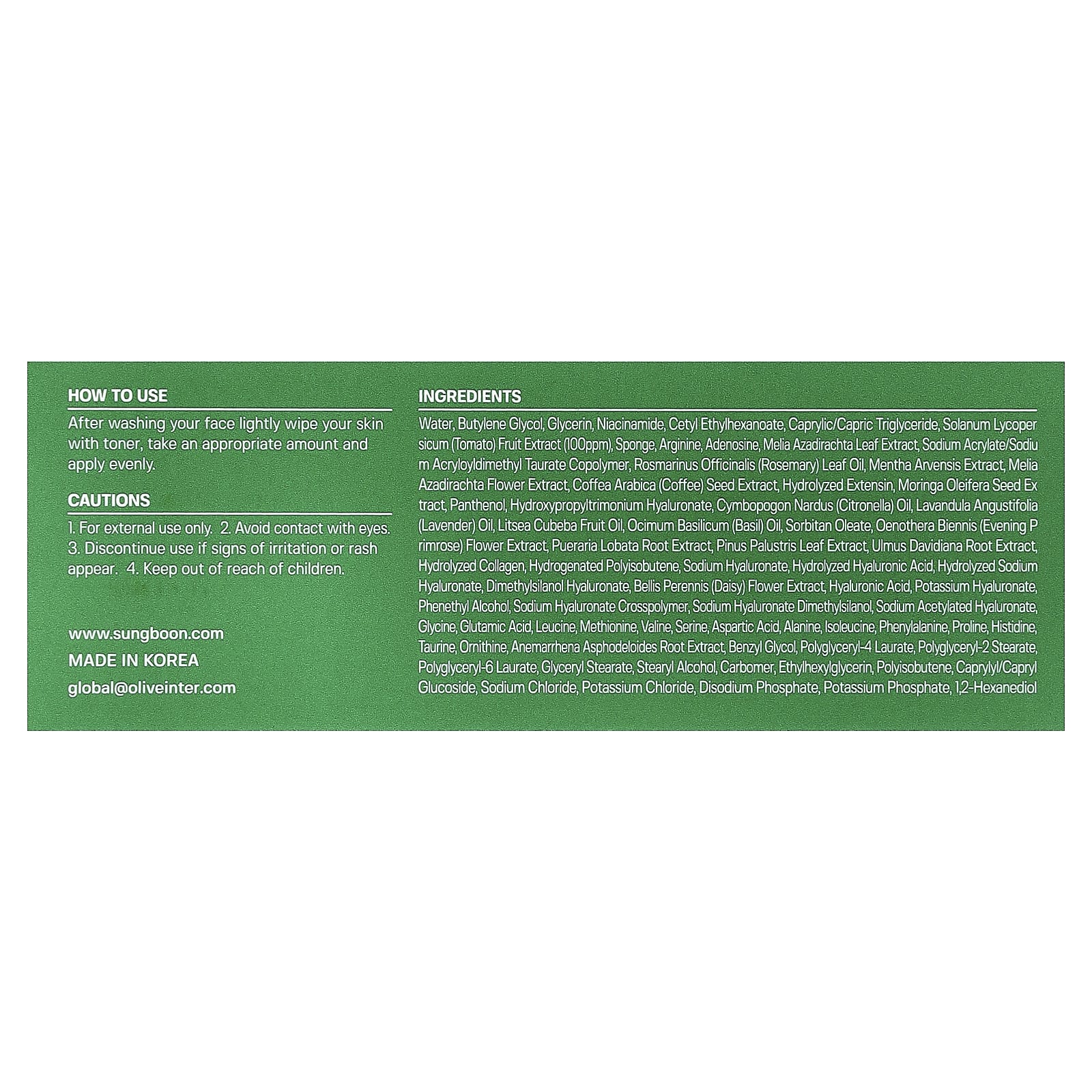 Вода, бутиленгликоль, глицерин, никотинамид, цетилэтилгексаноат, каприловый/каприновый триглицерид, экстракт плодов томата (Solanum lycopersicum) (100 част./млн), губка, аргинин, аденозин, экстракт листьев дерева ним (Melia azadirachta), натрий акрилат/натрий акрилоилдиметилтаурат сополимер, масло из листьев розмарина (Rosmarinus officinalis), экстракт полевой мяты (Mentha arvensis), экстракт цветков дерева ним (Melia azadirachta), экстракт зерен кофе арабики (Coffea arabica), гидролизованный экстенсин, экстракт семян моринги (Moringa oleifera), пантенол, гиалуронат гидроксипропилтримония, масло цитронеллы (Cymbopogon nardus), лавандовое масло (Lavandula angustifolia), масло плодов лицеи кубебы (Litsea cubeba), базиликовое масло (Ocimum basilicum), сорбитанолеат, экстракт цветков примулы вечерней (Oenothera biennis), экстракт корней пуэрарии дольчатой (Pueraria lobata), экстракт хвои сосны болотной (Pinus palustris), экстракт корня вяза Давида (Ulmus davidiana), гидролизованный коллаген, гидрогенизированный полиизобутен, гиалуронат натрия, гидролизованная гиалуроновая кислота, гидролизованный гиалуронат натрия, диметилсиланол гиалуронат, экстракт цветков маргаритки многолетней (Bellis perennis), гиалуроновая кислота, гиалуронат калия, фенетиловый спирт, кроссполимер гиалуроната натрия, гиалуронат натрия диметилсиланол, ацетилированный гиалуронат натрия, глицин, глутаминовая кислота, лейцин, метионина, валин, серин, аспарагиновая кислота, аланин, изолейцин, фенилаланин, пролин, гистидин, таурин, L-орнитин, экстракт корня анемаррены асфоделевой (Anemarrhena asphodeloides), бензилгликоль, полиглицерил-4 лаурат, полиглицерил-2 стеарат, полиглицерил-6 лаурат, глицерил стеарат, стеариловый спирт, карбомер, этилгексилглицерин, полиизобутен, каприлил/каприл глюкозид, хлорид натрия, хлорид калия, динатрия фосфат, фосфат калия, 1,2-гександиол.