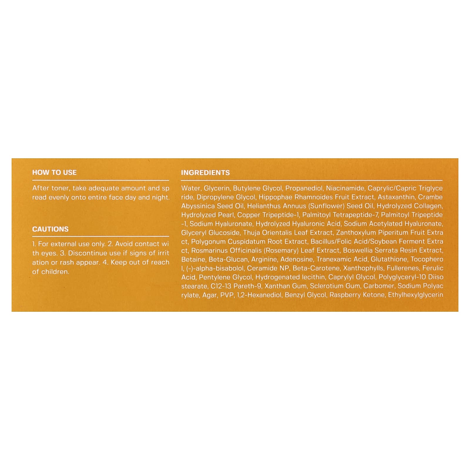 Вода, глицерин, бутиленгликоль, пропандиол, никотинамид, каприловый/каприновый триглицерид, дипропиленгликоль, экстракт плодов облепихи крушиновидной (Hippophae rhamnoides), астаксантин, масло семян катрана абиссинского (Crambe abyssinica), подсолнечное масло (Helianthus annuus), гидролизованный коллаген, гидролизованная жемчужина, меди трипептид-1, пальмитоил тетрапептид-7, пальмитоил трипептид -1, гиалуронат натрия, гидролизованная гиалуроновая кислота, ацетилированный гиалуронат натрия, глицерил глюкозид, экстракт листьев туи восточной (Thuja orientalis), экстракт сычуаньского перца (Zanthoxylum piperitum), экстракт корня рейнутрии японской (Polygonum cuspidatum), ферментированный экстракт палочковидной бактерии/фолиевой кислоты/соевых бобов, экстракт листьев розмарина (Rosmarinus officinalis), экстракт камеди босвеллии пильчатой (Boswellia serrata), бетаин, бета-глюкан, аргинин, аденозин, транексамовая кислота, глутатион, токоферол, (-)-альфа-бисаболол, керамид NP, бета-каротин, ксантофиллы, фуллеренов, феруловая кислота, пентилен гликоль, гидрогенизированный лецитин, каприлилгликоль, полиглицерил-10 диизостеарат, C12-13 парет-9, ксантановая камедь, смола склероций, карбомер, полиакрилат натрия, агар, ПВП, 1,2-гександиол, бензилгликоль, малиновый кетон, этилгексилглицерин.