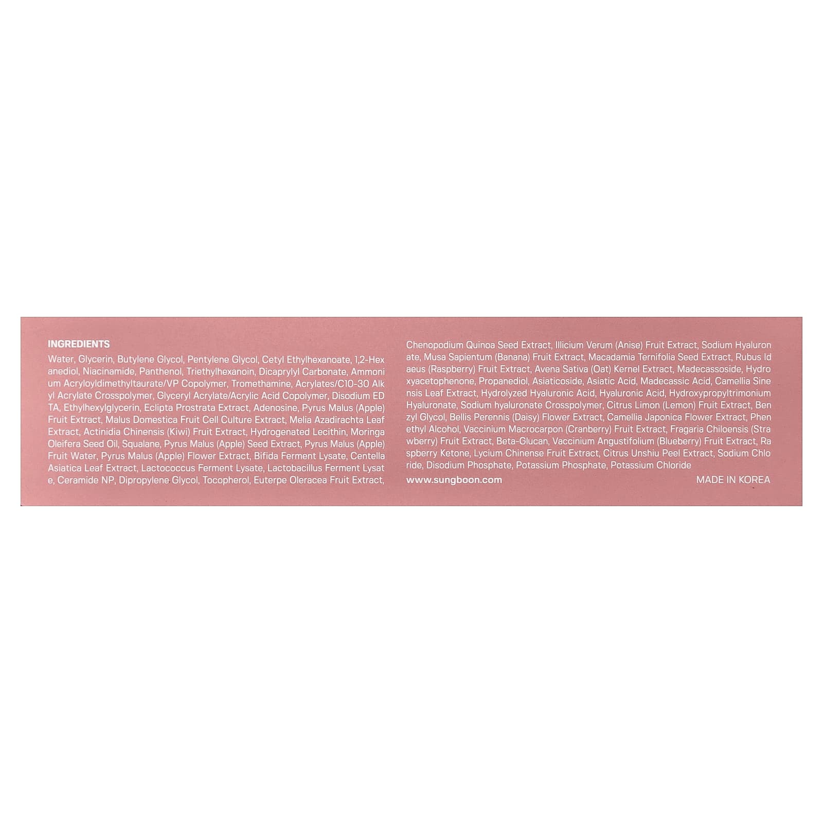 Вода, глицерин, бутиленгликоль, пентилен гликоль, цетилэтилгексаноат, 1,2-гександиол, никотинамид, пантенол, триэтилгексаноин, дикаприлил карбонат, аммоний акрилоилдиметилтаурат/ВП сополимер, трометамин, акрилат/c10-30 алкил акрилат кроссполимер, сополимер глицерил акрилата/акриловой кислоты, двунатриевая ЭД ТК, этилгексилглицерин, экстракт эклипты простёртой (Eclipta prostrata), аденозин, экстракт яблока (Pyrus malus), экстракт культуры клеток плодов яблони домашней (Malus domestica), экстракт листьев дерева ним (Melia azadirachta), экстракт плодов киви (Actinidia chinensis), гидрогенизированный лецитин, масло из семян моринги масличной (Moringa oleifera), сквалан, экстракт косточек яблока (Pyrus malus), соковая вода из яблок (Pyrus malus), экстракт цветков яблони (Pyrus malus), лизат ферментов бифидобактерий, экстракт листьев готу колы (Centella asiatica), лизат ферментов лактококка, лизат продукта ферментации лактобактерий, керамид NP, дипропиленгликоль, токоферол, экстракт ягод асаи (Euterpe oleracea), экстракт киноа (Chenopodium quinoa), экстракт плодов аниса звездчатого (Illicium verum), гиалуронат натрия, экстракт плодов банана (Musa sapientum), экстракт семян макадамии (Macadamia ternifolia), экстракт ягод малины (Rubus idaeus), экстракт ядер овса (Avena sativa), мадекассосид, гидроксиацетофенон, пропандиол, азиатикозид, азиатиковая кислота, мадекассовая кислота, экстракт листьев зелёного чая (Camellia sinensis), гидролизованная гиалуроновая кислота, гиалуроновая кислота, гиалуронат гидроксипропилтримония, кроссполимер гиалуроната натрия, экстракт плодов лимона (Citrus limon), бензилгликоль, экстракт цветков маргаритки многолетней (Bellis perennis), экстракт цветков камелии японской (Camellia japonica), фенетиловый спирт, экстракт ягод клюквы (Vaccinium macrocarpon), экстракт ягод клубники (Fragaria chiloensis), бета-глюкан, экстракт ягод голубики (Vaccinium angustifolium), малиновый кетон, экстракт ягод годжи (Lycium chinense), экстракт цедры мандарина уншиу (Citrus unshiu), хлорид натрия, динатрия фосфат, фосфат калия, хлорид калия.