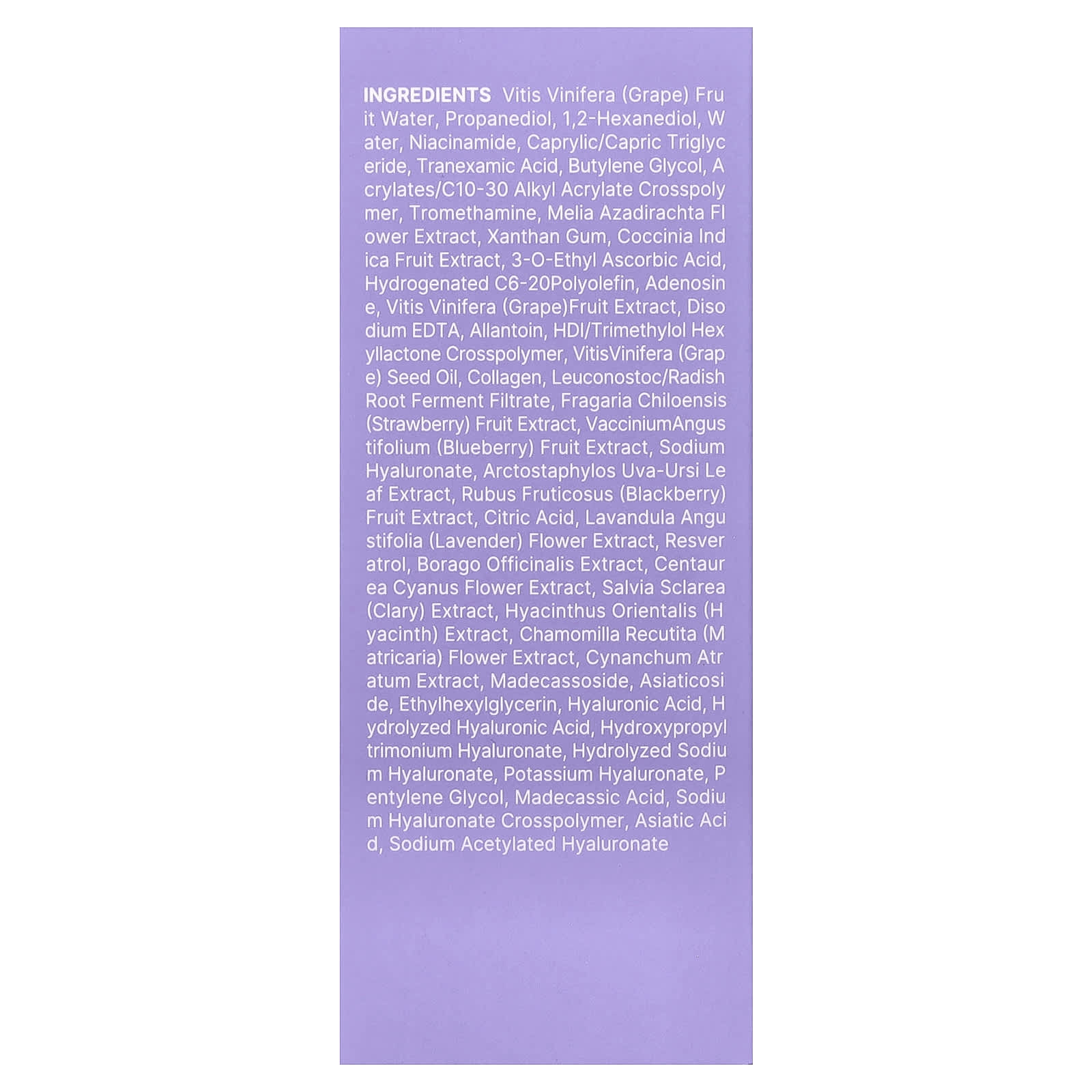 виноградная соковая вода (Vitis vinifera), пропандиол, 1,2-гександиол, вода, никотинамид, каприловый/каприновый триглицерид, транексамовая кислота, бутиленгликоль, акрилат/c10-30 алкил акрилат кроссполимер, трометамин, экстракт цветков дерева ним (Melia azadirachta), ксантановая камедь, экстракт плодов кокцинии индийской (Coccina indica), 3-о-этил-аскорбиновая кислота, гидрогенизированный полиолефин c6-20, аденозин, экстракт плодов винограда (Vitis vinifera), двунатриевая ЭДТК, аллантоин, гександиизоцианат/триметилол хексиллактона кроссполимер, масло из виноградных косточек (Vitis vinifera), коллаген, лейконосток/ферментированный фильтрат корня редиса, экстракт ягод клубники (Fragaria chiloensis), экстракт ягод голубики (Vaccinium angustifolium), гиалуронат натрия, экстракт листьев толокнянки обыкновенной (Arctostaphylos uva-ursi), экстракт ягод ежевики (Rubus fructicosus), лимонная кислота, экстракт цветков лаванды (Lavandula angustifolia), ресвератрол, экстракт бурачника (Borago officinalis), экстракт цветков василька (Centaurea cyanus), экстракт шалфея (Salvia sclarea), экстракт гиацинта (Hyacinthus orientalis), экстракт цветков ромашки лекарственной (Chamomilla recutita), экстракт цинанхума (Cynanchum atratum), мадекассосид, азиатикозид, этилгексилглицерин, гиалуроновая кислота, гидролизованная гиалуроновая кислота, гиалуронат гидроксипропилтримония, гидролизованный гиалуронат натрия, гиалуронат калия, пентилен гликоль, мадекассовая кислота, кроссполимер гиалуроната натрия, азиатиковая кислота, ацетилированный гиалуронат натрия.