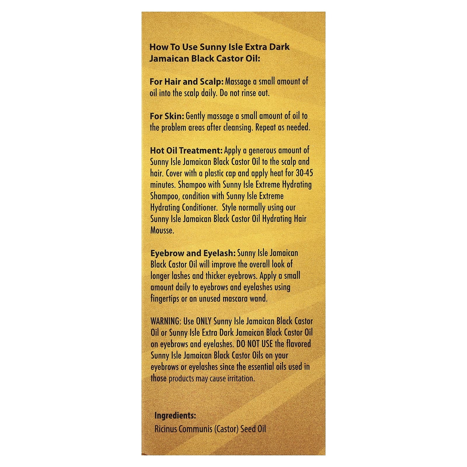 Для ухода за бровями и ресницами используйте только ямайское черное касторовое масло Sunny Isle или экстрачерное ямайское черное касторовое масло Sunny Isle. Не наносите ароматизированное ямайское черное касторовое масло Sunny Isle на брови и ресницы, поскольку эфирные масла, содержащиеся в этих продуктах, могут вызвать раздражение.