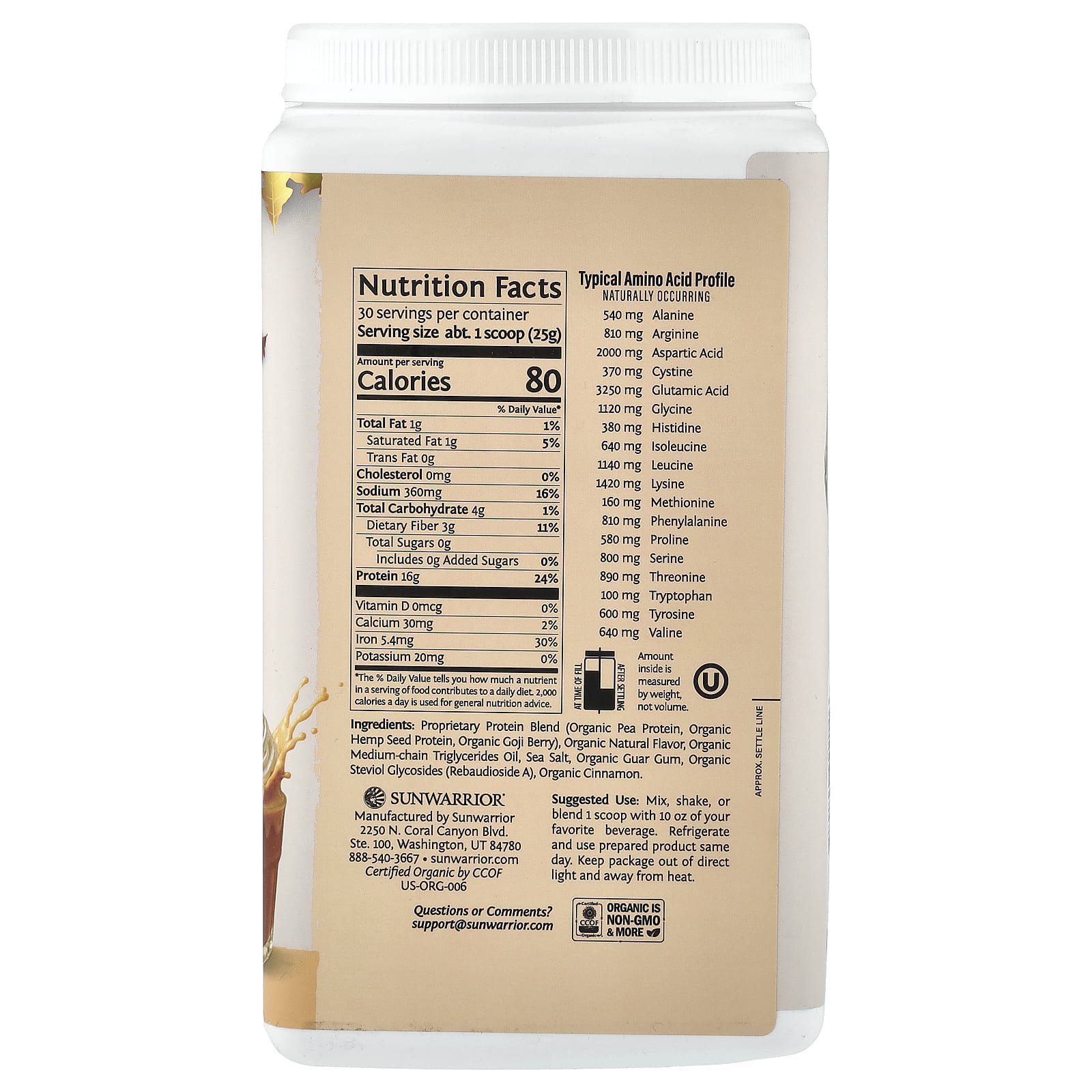 Запатентованная протеиновая смесь (органический гороховый протеин, протеин из семян органической конопли, органические ягоды годжи), органический натуральный ароматизатор, масло со среднецепочечными триглицеридами, морская соль, органическая гуаровая камедь, органические стевиолгликозиды (ребаудиозид A), органическая корица.