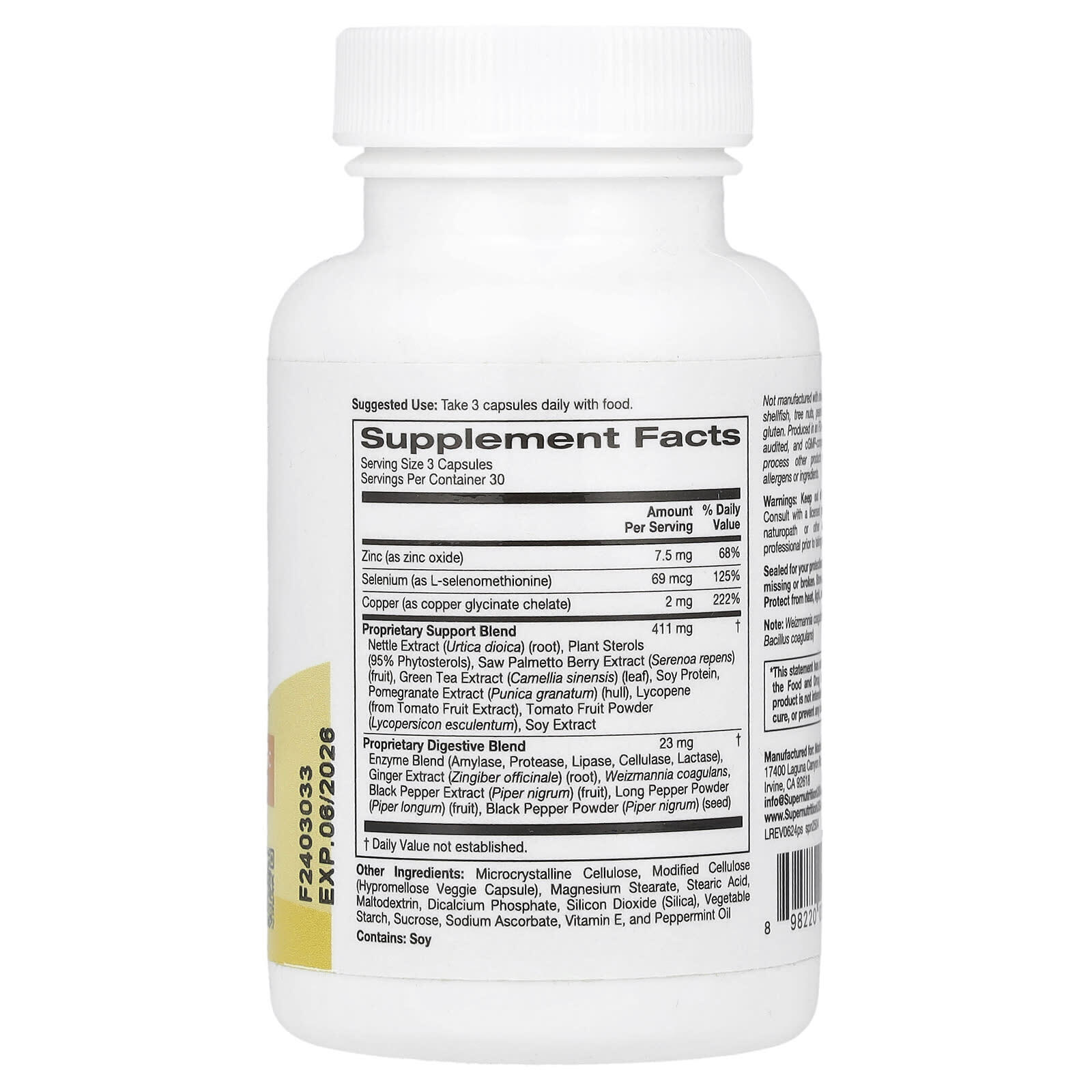 Добавка для поддержки предстательной железы от Super Nutrition® содержит комплексную смесь синергических ингредиентов, таких как экстракты ягод серенои, корня крапивы, зелёного чая и граната, фитостеролы, цинк, селен и ликопин, а также синергические ферменты и спорообразующий пробиотик Weizmannia coagulans (ранее бактерии бациллус коагуланс (Bacillus coagulans)). Специальный состав для поддержания здоровья простаты*.