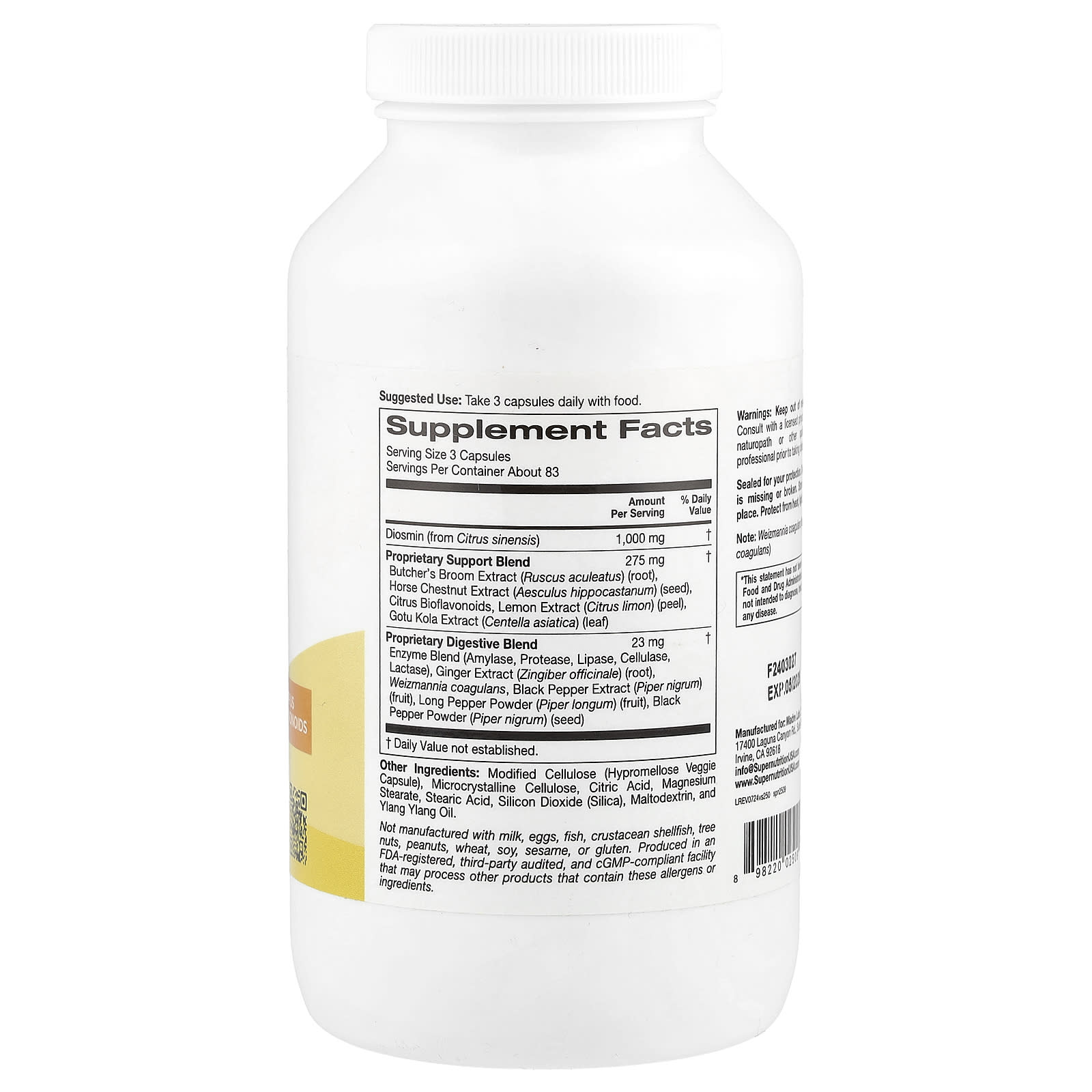 Добавка для поддержки вен от Super Nutrition® содержит комплексную смесь синергических ингредиентов, таких как диосмин, иглица колючая, конский каштан, готу кола, цитрусовые биофлавоноиды и экстракт кожуры лимона, а также синергические ферменты и спорообразующий пробиотик Weizmannia coagulans (ранее бактерии бациллус коагуланс (Bacillus coagulans)). Средство разработано для поддержания целостности сосудов*.